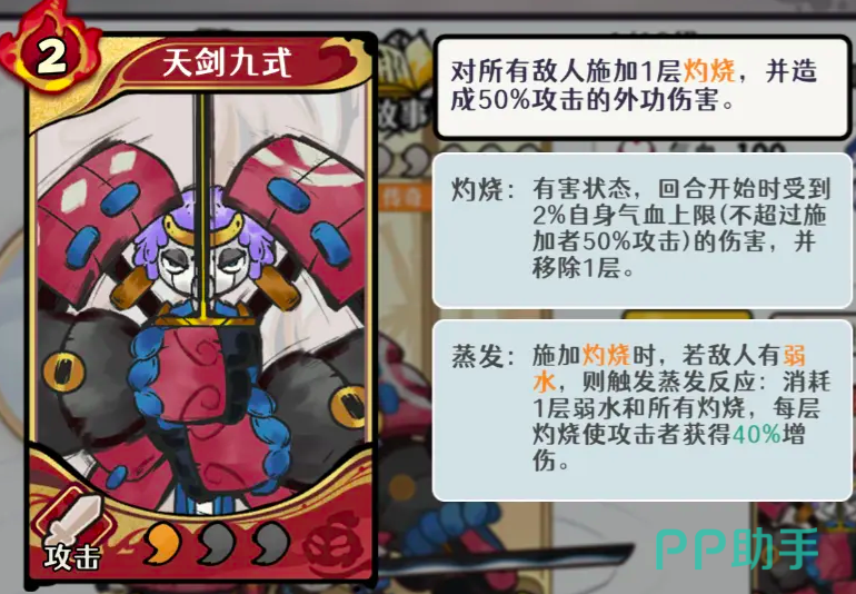 核心武学卡牌名为“天剑九式”,当对全体敌人成功附加至少一层灼烧时,将额外触发一次范围外功伤害,数值为自身攻击的50%。角色具备双重元素反应能力:“灼烧”与“蒸发”。其中,“灼烧”为持续性负面状态,每回合开始时造成相当于自身气血上限2%的真实伤害,并自动移除一层;但该效果生效前提为:目标当前气血上限不得高于施加者攻击力的50%。“蒸发”则为联动反应——若目标已存在“弱水”状态,且此时被施加灼烧,则立即消耗1层弱水及所有已存在的灼烧层数;每消耗1层灼烧,施加者获得40%外功增伤,可叠加。
