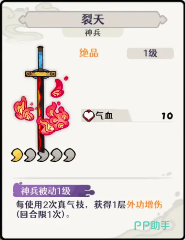 专属神兵“裂天”赋予独特成长机制:每累计使用两次真气技能,即可获得1层外功增伤效果,但该增益每回合最多触发一次。此外,角色天赋自带经济收益——可稳定产出100至200铜钱,需玩家通关宝钱庄历练副本方可激活,该副本整体难度适中,无高门槛限制。