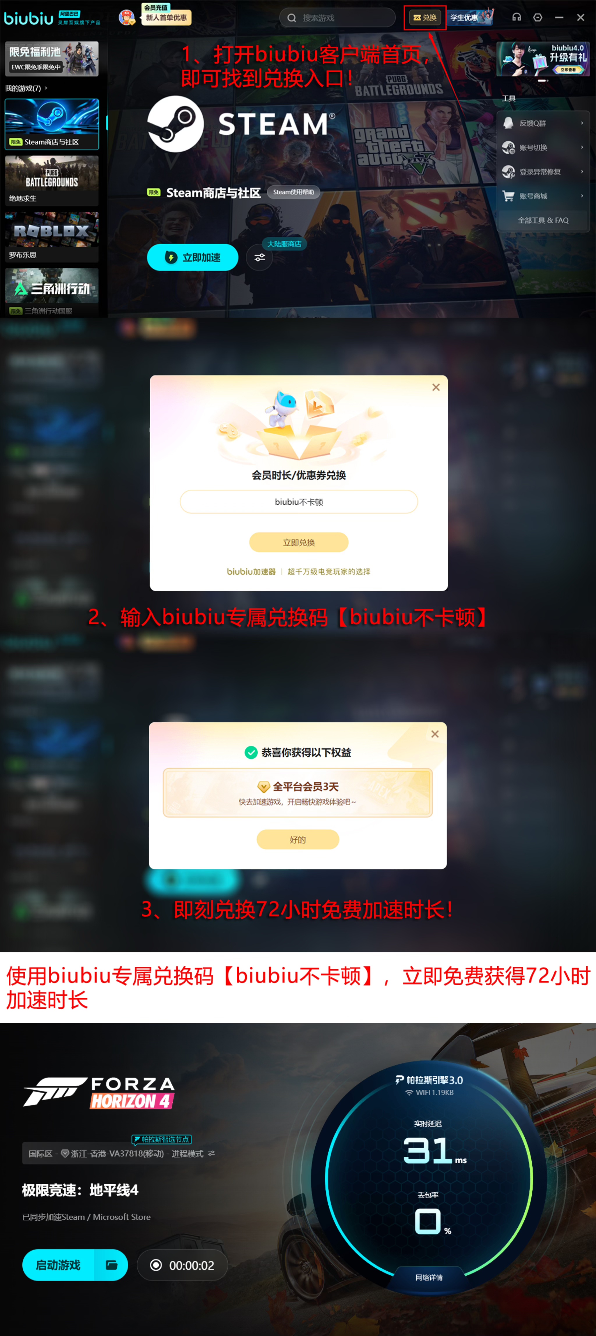 考虑到用户决策成本,biubiu提供零门槛试用机制:新注册账号自动获得24小时全功能免费加速权限,无需绑定支付方式即可完整测试加速效果;老用户亦可参与限时回馈活动,输入口令“biubiu不卡顿”领取额外3天高级加速服务,该权益面向所有有效账户开放,不限注册时间。