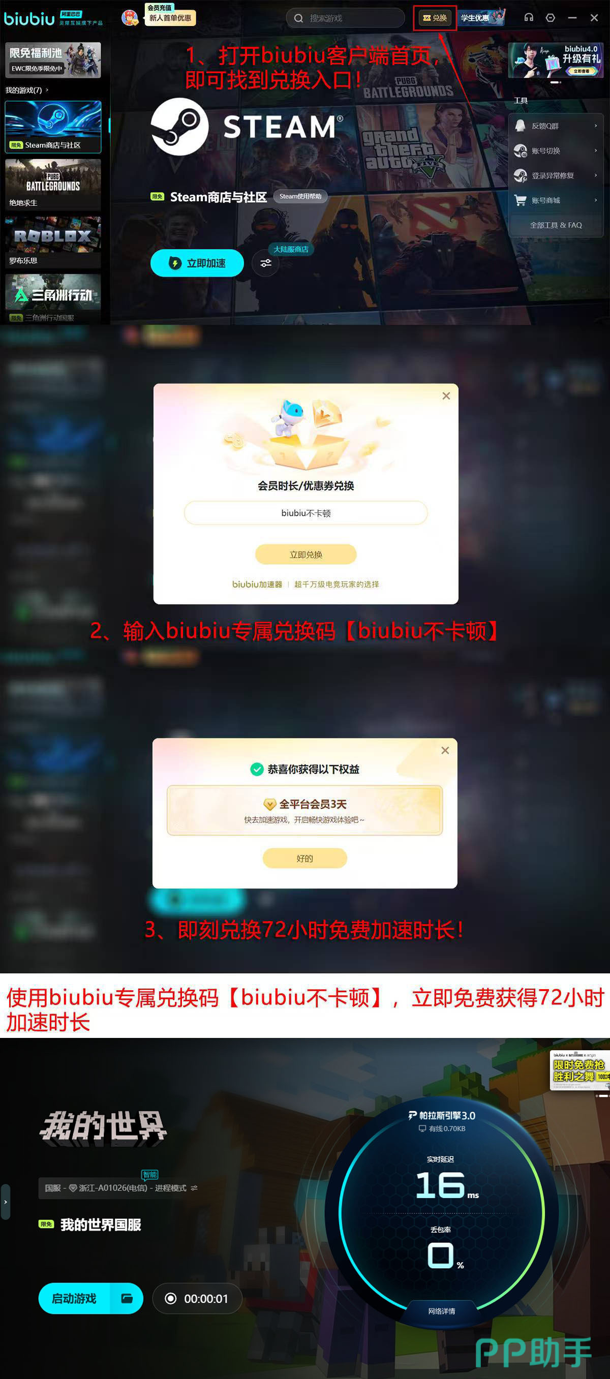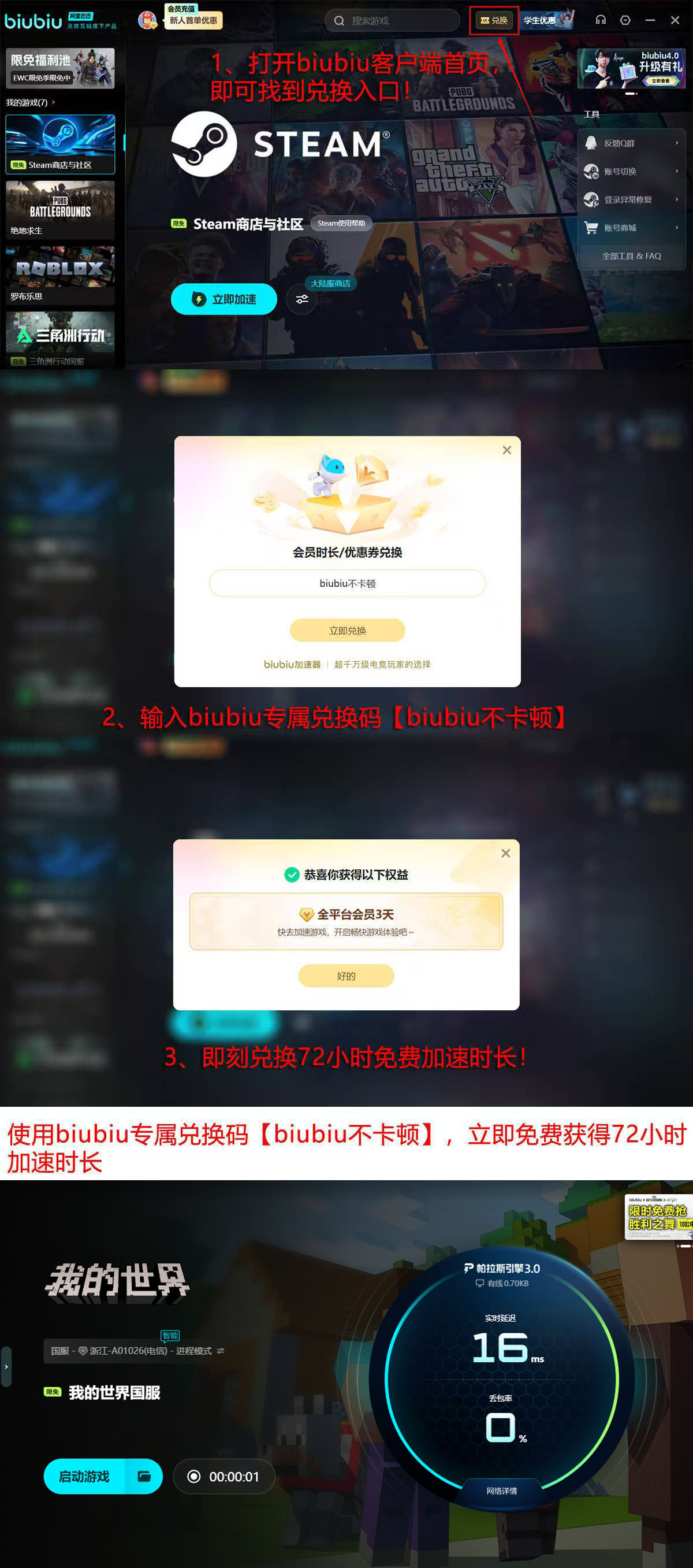 使用biubiu加速器后,《我的世界》联机过程中的卡顿、掉线、加载缓慢及突发闪退等问题均得到明显缓解,复杂红石电路运算、多人协同建造、实时生物群系切换等高负载操作亦可稳定执行。新用户现可免费获取总计96小时加速时长:注册成为biubiu新会员即赠24小时;随后进入客户端首页点击“兑换”按钮,在弹窗中输入口令【biubiu不卡顿】,即可额外领取72小时。两项权益可叠加使用,无需重复操作。