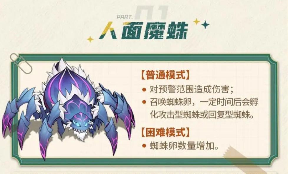 第一位要介绍的是人面魔蛛,普通模式下,它会对预警范围造成伤害,召唤出蜘蛛卵,一定时间后会孵化攻击型蜘蛛或者是回复型蜘蛛,到了困难模式会有更多的蜘蛛卵出来。面对这个boss时,玩家需要躲避预警技能,降低队伍损伤,提前去攻击蜘蛛卵,阻止功能性蜘蛛卵的孵化。