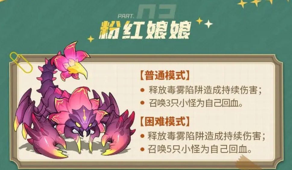 第三位要介绍的是粉红娘娘,普通模式下,释放毒雾陷阱造成持续伤害,召唤出3只小怪为自己回血,困难模式的话,它会释放毒雾陷阱持续造成伤害,召唤5只小怪为自己进行回血。想要击败这个boss的话,需要在躲避毒雾陷阱的同时及时地击杀小怪,从而防止boss回血。