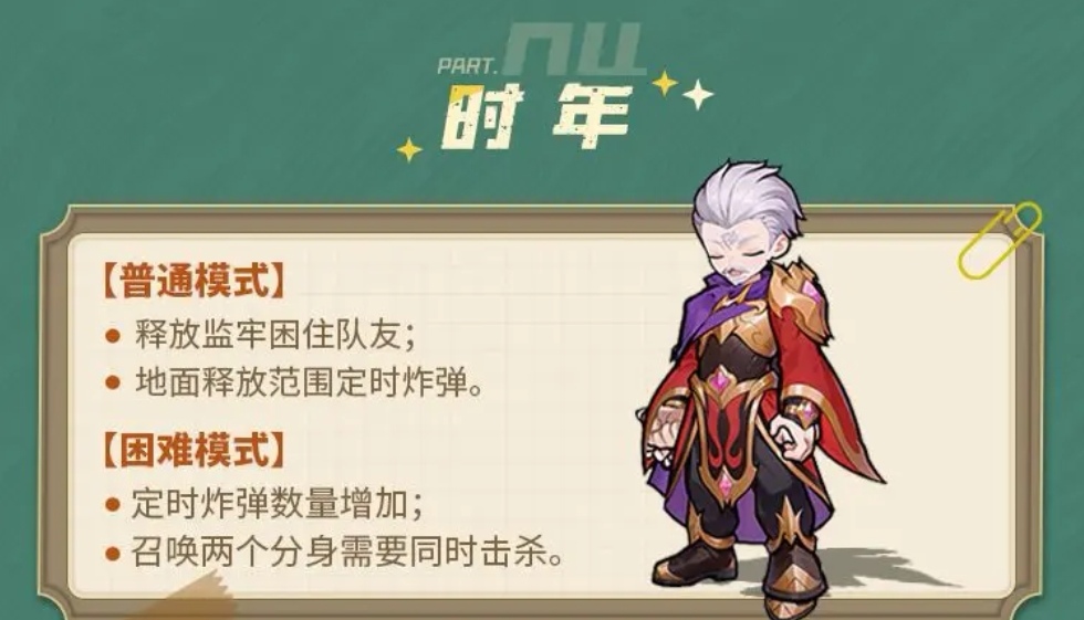 第四位要介绍的是时年,普通模式下的时年会制造出一间牢狱来控制队友,地面释放出几颗范围性定时炸弹,在困难模式中,时年会增加定时炸弹的数量并召唤出两个分身。击败时年的技巧就是要躲避预警技能,及时打破监牢救出被困的队友,困难模式的话,要先把两个分身打成残血,再一石二鸟。