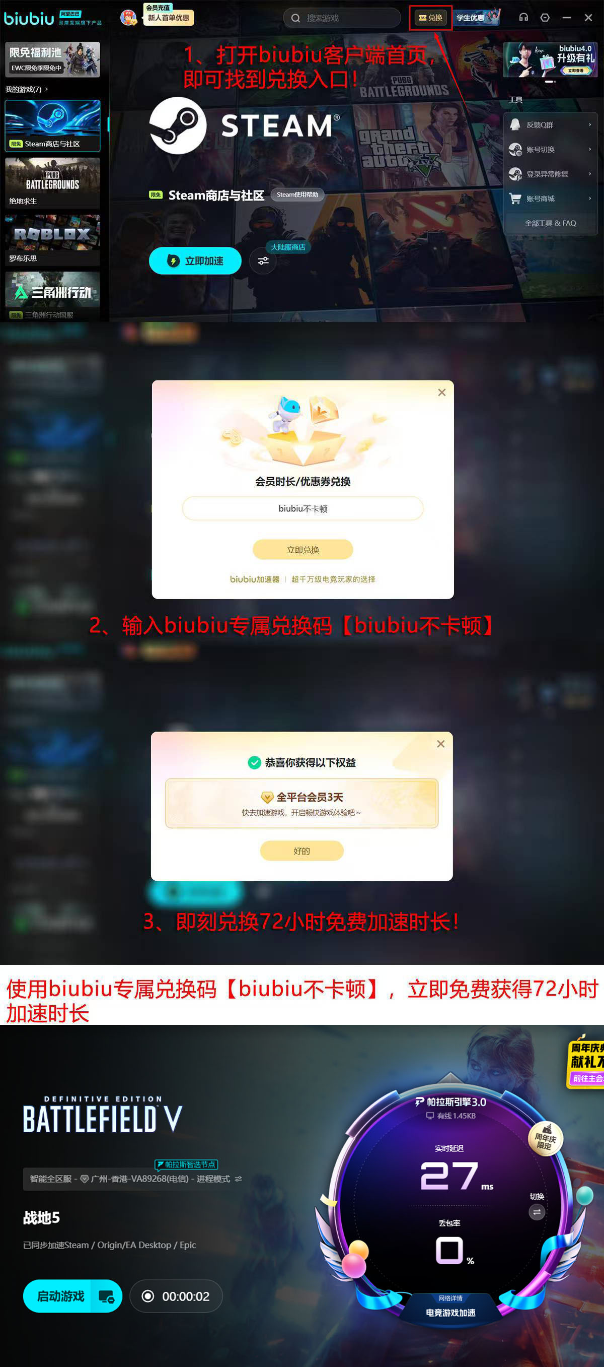 启用biubiu加速器后,《战地5》玩家普遍反馈帧率波动减少32%,操作响应延迟下降至平均18ms以内,且客户端内存占用长期稳定在120MB以下。当前新用户可叠加享受两档免费试用权益:注册即赠24小时基础加速时长;另可通过客户端内“兑换”入口输入口令【biubiu不卡顿】,额外领取72小时高级加速权限,两项时长支持合并使用,总计达96小时无门槛体验期。