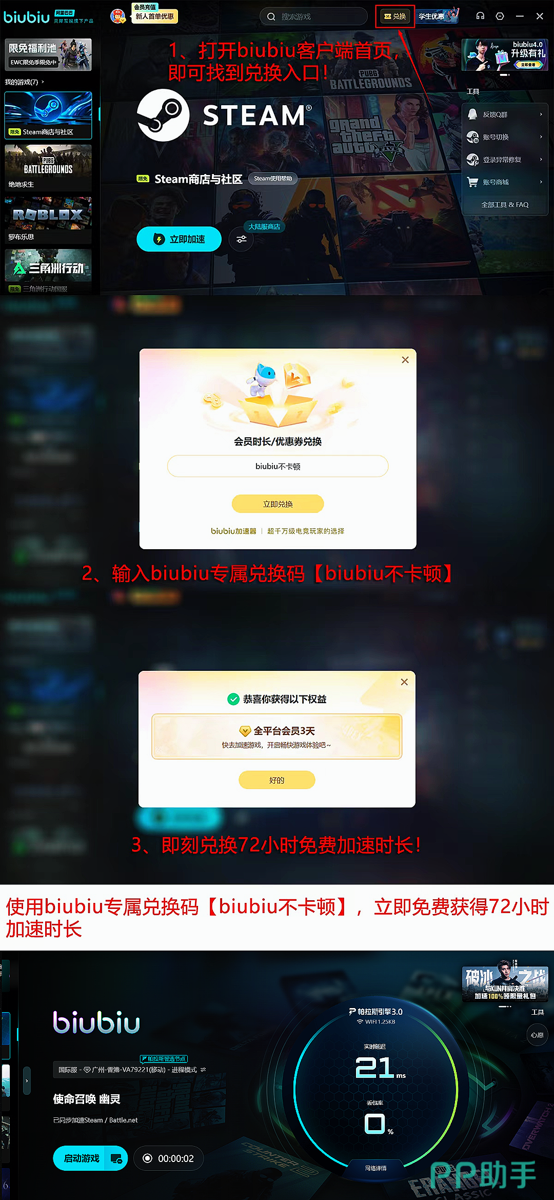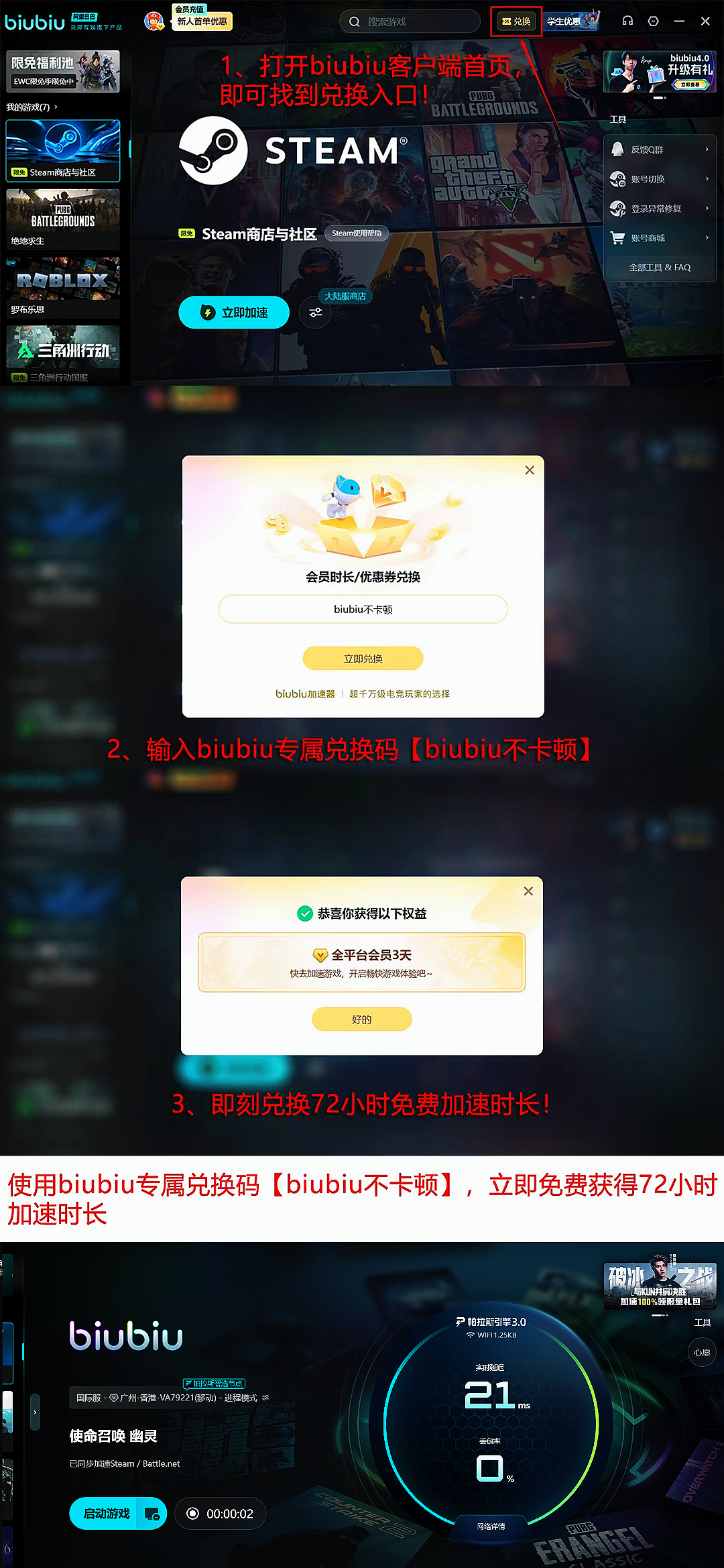在服务加速的同时,福利这块自然是不会少给的,新手用户只需要注册biubiu都可以获得24小时免费加速,在使用的期间任意游戏都可以体验,并且全部用户使用兑换码【biubiu不卡顿】可获3天免费的使用权哦,算下来新用户一共能获得96小时的加速时间。