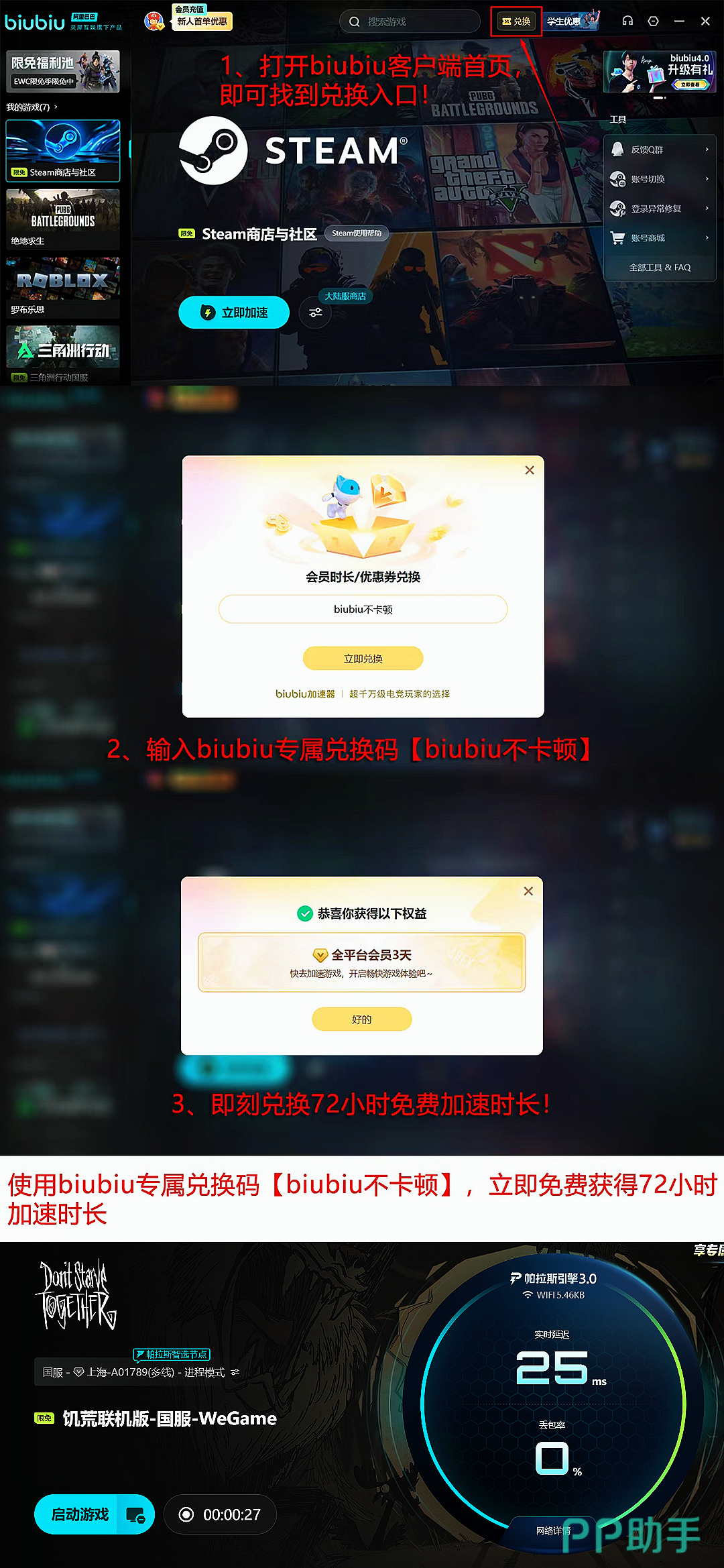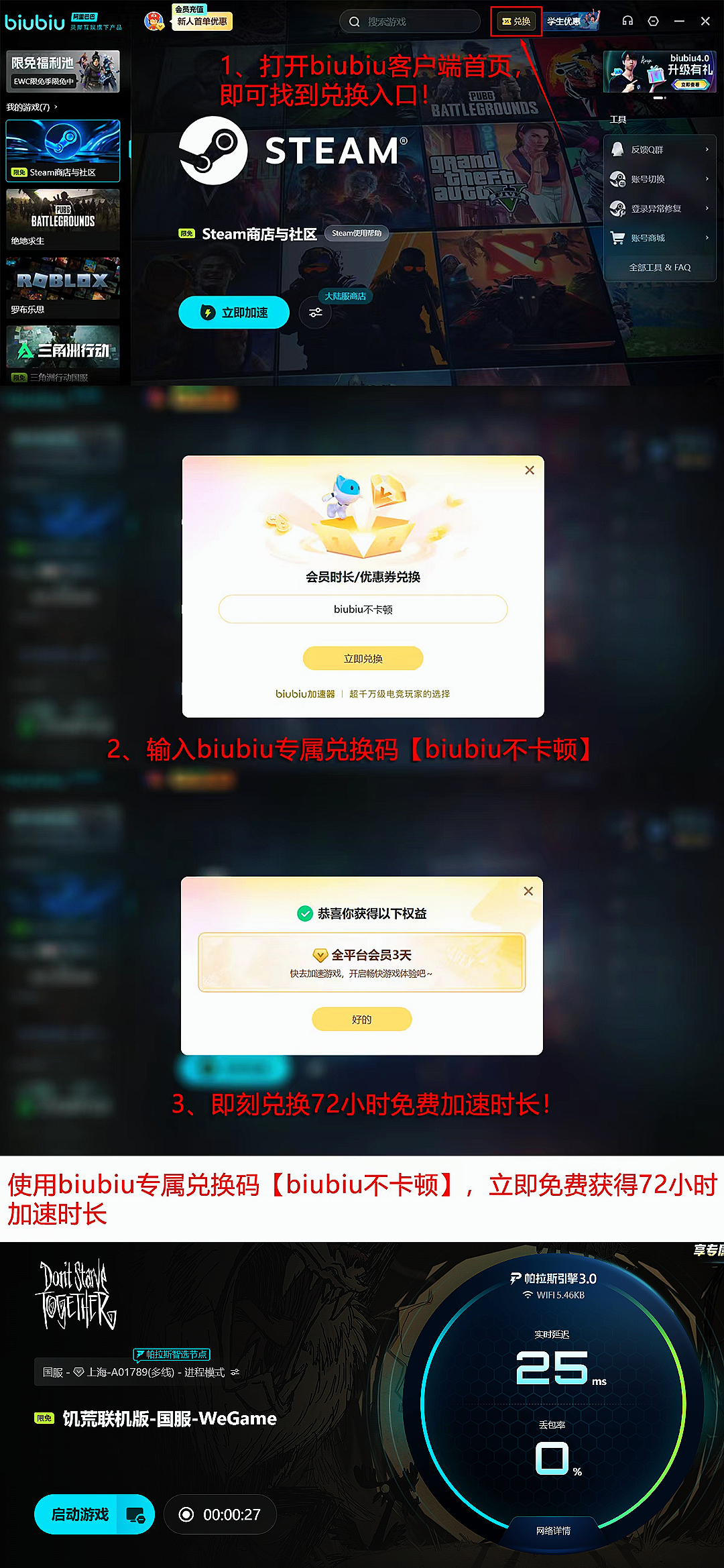 在性能升级的同时,biubiu加速器同步推出新用户激励政策:完成注册后即可领取24小时全游戏通用加速时长;输入专属兑换码【biubiu不卡顿】,还可额外激活3天连续使用权,总计达96小时。该福利面向全部用户开放,包括已有账号的老用户亦可参与领取。