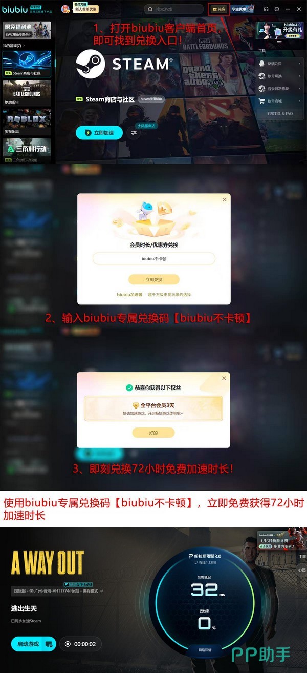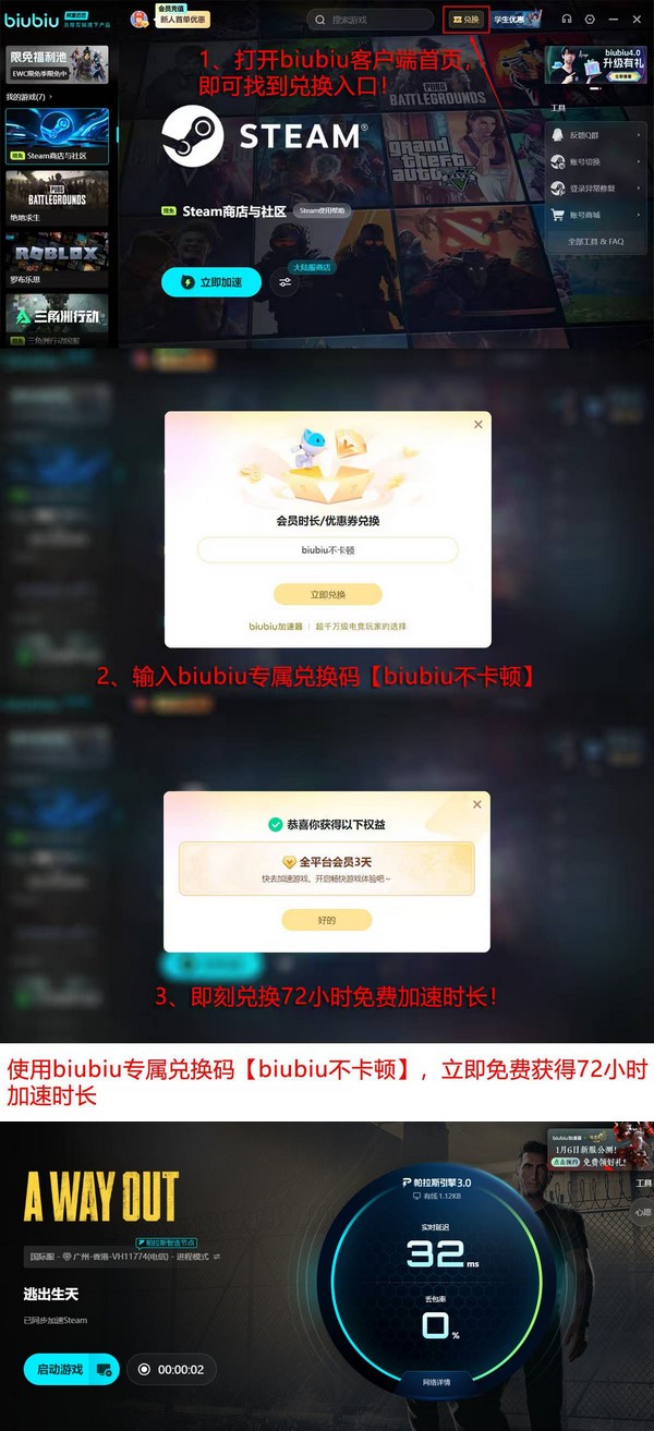 为便于用户评估实际效果,现开放“biubiu不卡顿”限时兑换码,可免费激活3小时连续加速服务,该码适用于全部注册用户,且每个账户限用一次。新用户完成注册后将自动获赠24小时基础体验时长,叠加兑换权益后总计可达4天免付费使用周期。此外,平台活动中心持续更新福利计划,涵盖限定测试资格发放、周边实物抽奖及正版游戏赠送等多样化回馈形式。