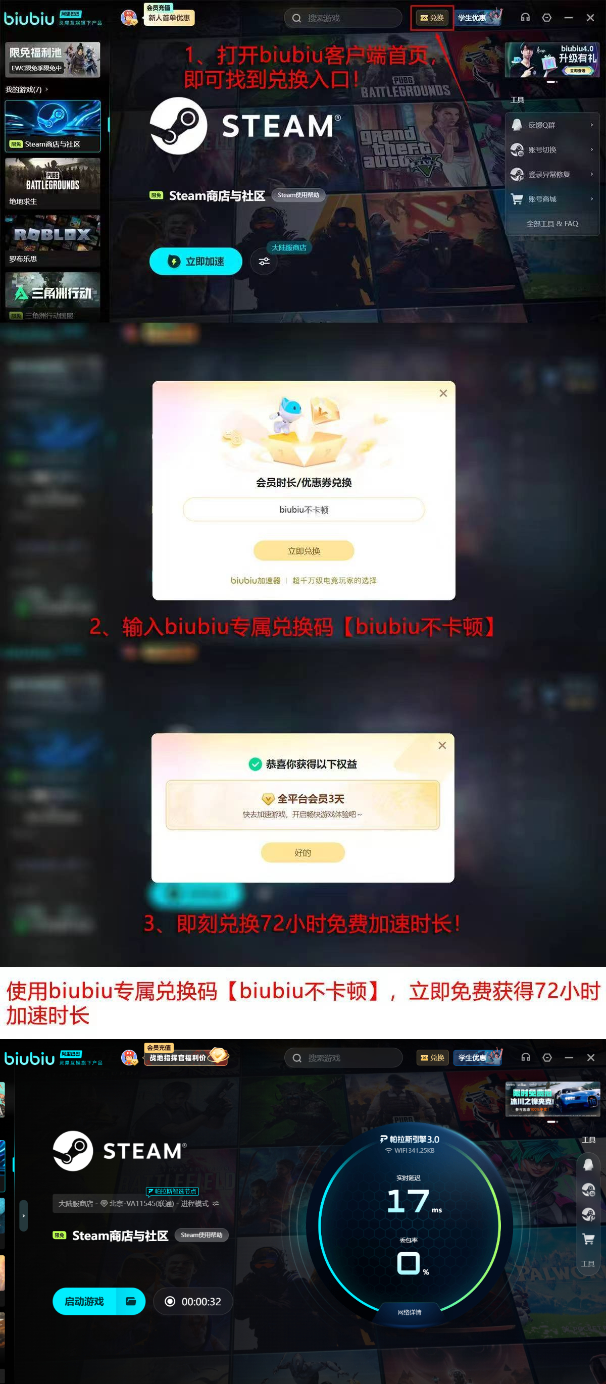 为降低新用户使用门槛,现推出限时体验计划:新注册用户可立即获得24小时全游戏免费加速权限;输入激活码【biubiu不卡顿】,即可额外解锁72小时连续加速权益,总计畅玩时长可达96小时。