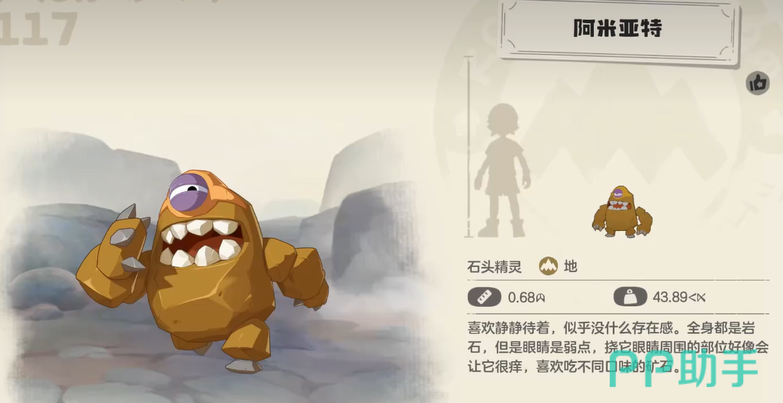 从外观设计来看,阿米亚特通体覆盖致密岩甲,形似移动的微型山丘,整体造型粗犷厚重,直观传递出高防御与环境适应性的设定逻辑。其眼部区域裸露未被岩石包裹,构成视觉焦点,也暗示该部位为相对薄弱点——这一细节与其沙漠栖息地的生存演化高度契合:长期应对风沙侵蚀与昼夜温差,促使体表形成天然岩质护甲。