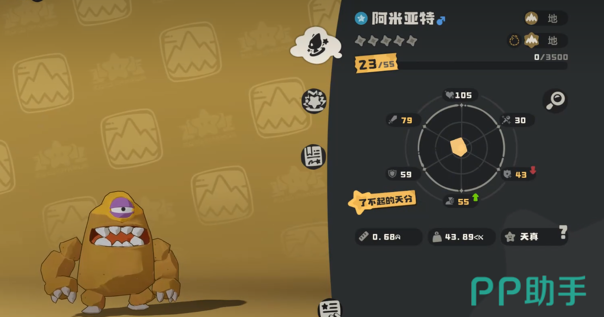 需注意的是,初始捕获的阿米亚特等级偏低,技能池尚未解锁关键招式(如“地震”“岩崩”“大地之力”等),实战表现暂不突出。但这并非资质缺陷,而是其成长曲线的自然阶段特征。该精灵属于典型“厚积型”单位,随着等级提升、技能学习及形态进化完成,各项属性与战术价值将实现跃升,最终成长为队伍中的稳定输出与坦控双修核心。