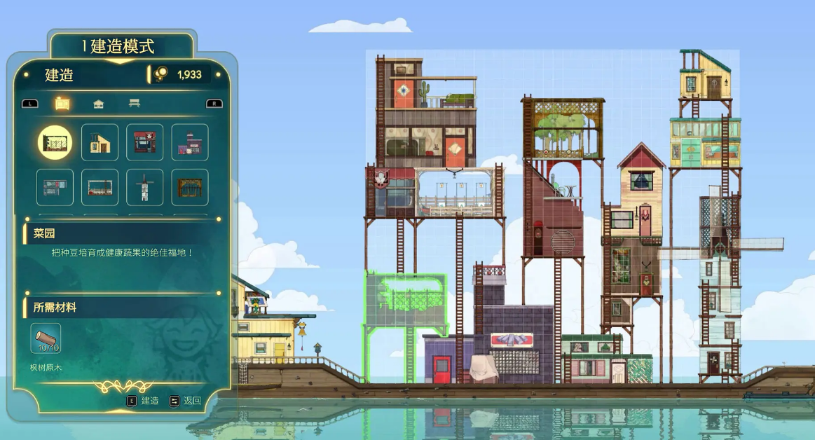 在该游戏内,玩家是可以去通过收集木材、矿石、布料等资源扩建渡船设施的,像厨房、菜园、纺织工坊等都是其中之一,而且建造系统的表现也非常不错,主要是采用类似俄罗斯方块的拼接机制,要求玩家合理规划空间布局,兼顾功能性与美观表现。