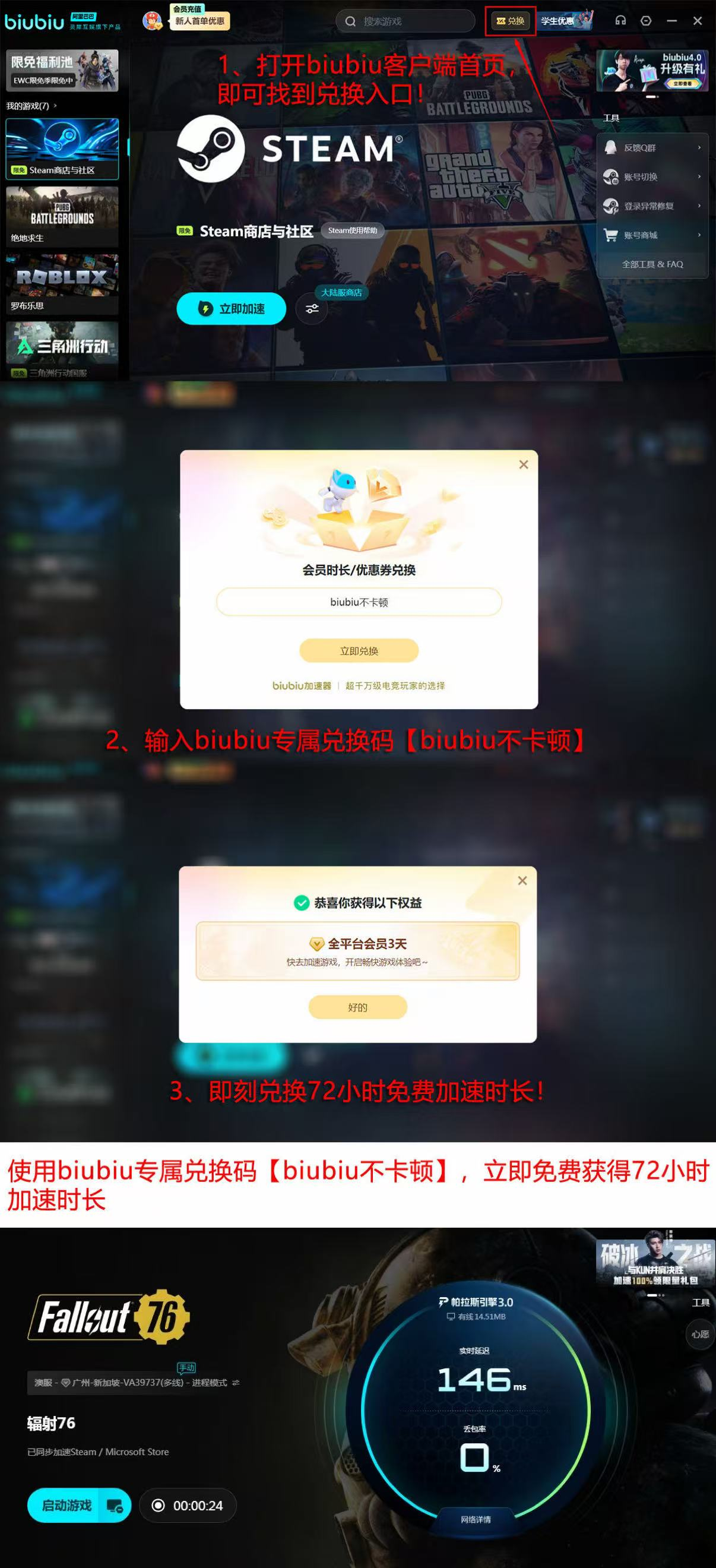 新用户注册即可领取24小时全功能免费试用权限;叠加官方发放的兑换码【biubiu不卡顿】,额外获得3天加速时长,总计96小时免付费体验周期,足够完成初期避难所搭建、主线任务推进及多人协作副本挑战。