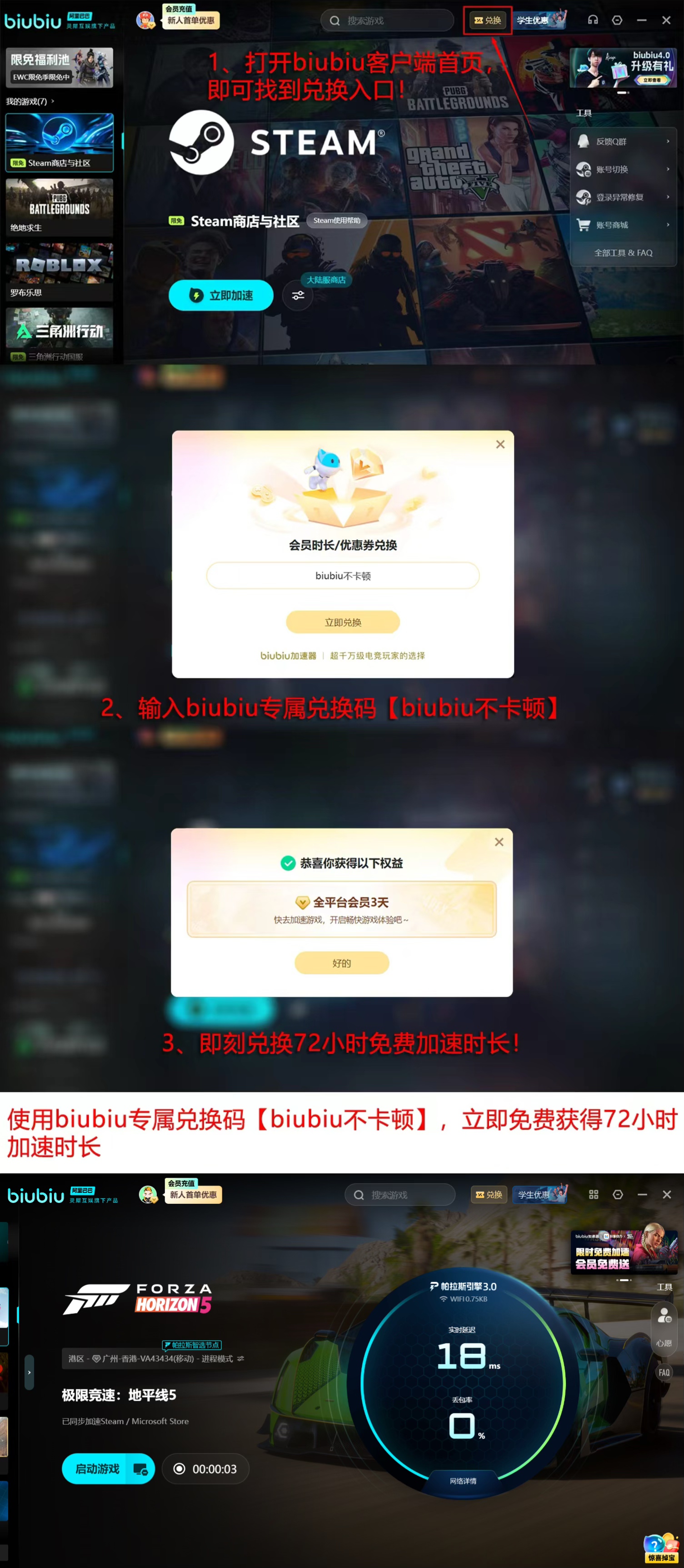 目前新注册用户可获得24小时全功能试用权限,覆盖完整游戏启动、在线匹配及持续游玩场景。另提供通用兑换码【biubiu不卡顿】,激活后即时到账3天高级加速服务,不限设备与账号类型,适用于所有版本客户端(Steam/微软商店/Xbox App)。