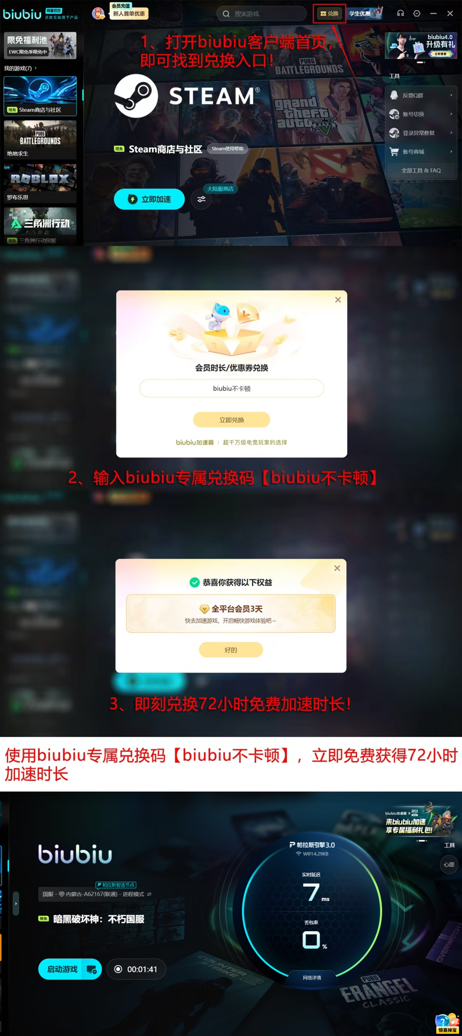 为验证实际效果,平台开放零门槛体验机制:新用户完成注册后自动获赠24小时全功能试用权限;所有账户均可凭兑换码【biubiu不卡顿】额外领取72小时加速服务,期间可自由切换《暗黑破坏神:不朽》专属优化节点,实时监测延迟值、丢包率及帧同步稳定性等核心指标。