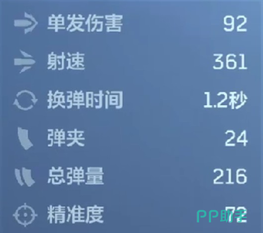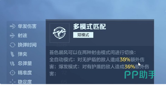基础性能层面,苔色暴风具备扎实的数值支撑:单发伤害稳定维持在92点,射速达361发/分钟,配合仅1.2秒的换弹时间,显著压缩火力中断窗口;24发弹匣容量与216发总备弹量,保障中高强度对抗下的持续压制能力。真正构成差异化优势的是其双射击模式与技能协同设计——玩家可即时切换全自动模式或爆发模式。其中,全自动模式对无护盾目标附加30%额外伤害,适用于近距快节奏压制;爆发模式则对带护盾单位提供30%额外伤害加成,有效破解防御型打法。