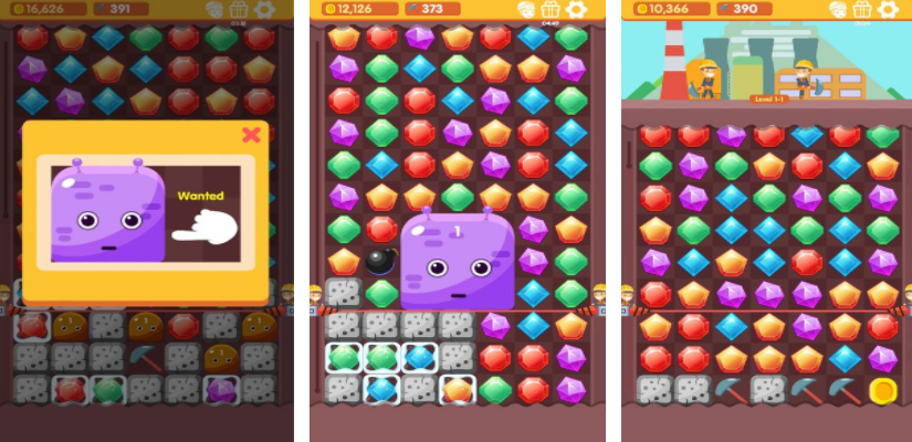 将三消机制与重力解谜结合,形成独特玩法循环。游戏界面为分层矿脉结构,玩家通过滑动匹配同色宝石触发消除,引发上方岩块与冰晶下落;坠落物撞击底层障碍后可震裂封印,释放被掩埋的高级矿石。操作门槛低,适配单手操作场景,但深层关卡需预判连锁反应路径。