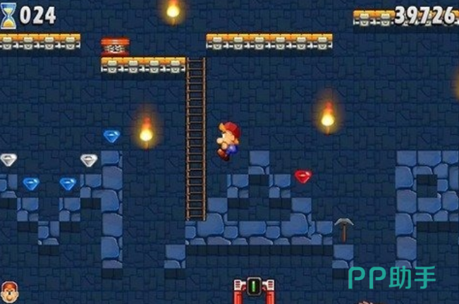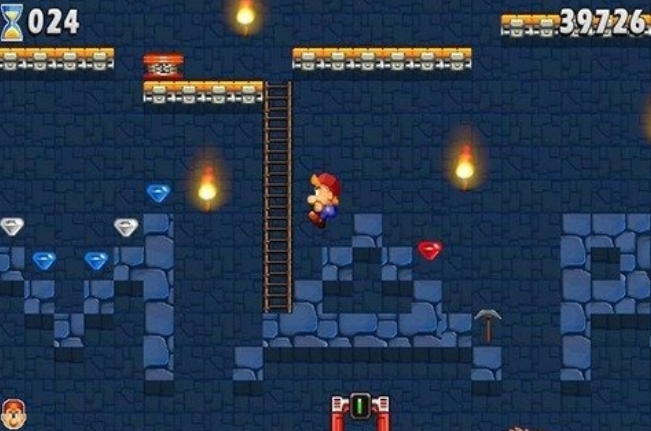 采用经典像素美术风格,构建高自由度的垂直探索空间。角色具备跳跃、攀爬与道具交互能力,需灵活运用场景中的绳索、弹簧板与移动平台抵达高价值矿物区。矿洞内分布多类型敌对单位,部分区域存在限时坍塌机制,要求玩家在收集宝石与规避风险间快速决策。