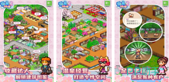 延续前作核心框架,在传统温泉旅馆经营基础上新增露天温泉、药浴池、观景汤屋等多样化设施类型,每类具备差异化功能属性,可精准匹配不同客群需求。画面延续高辨识度像素风格,色调柔和、构图宁静,配合随机访客事件与周期性挑战任务,增强长期游玩粘性与策略延展空间。