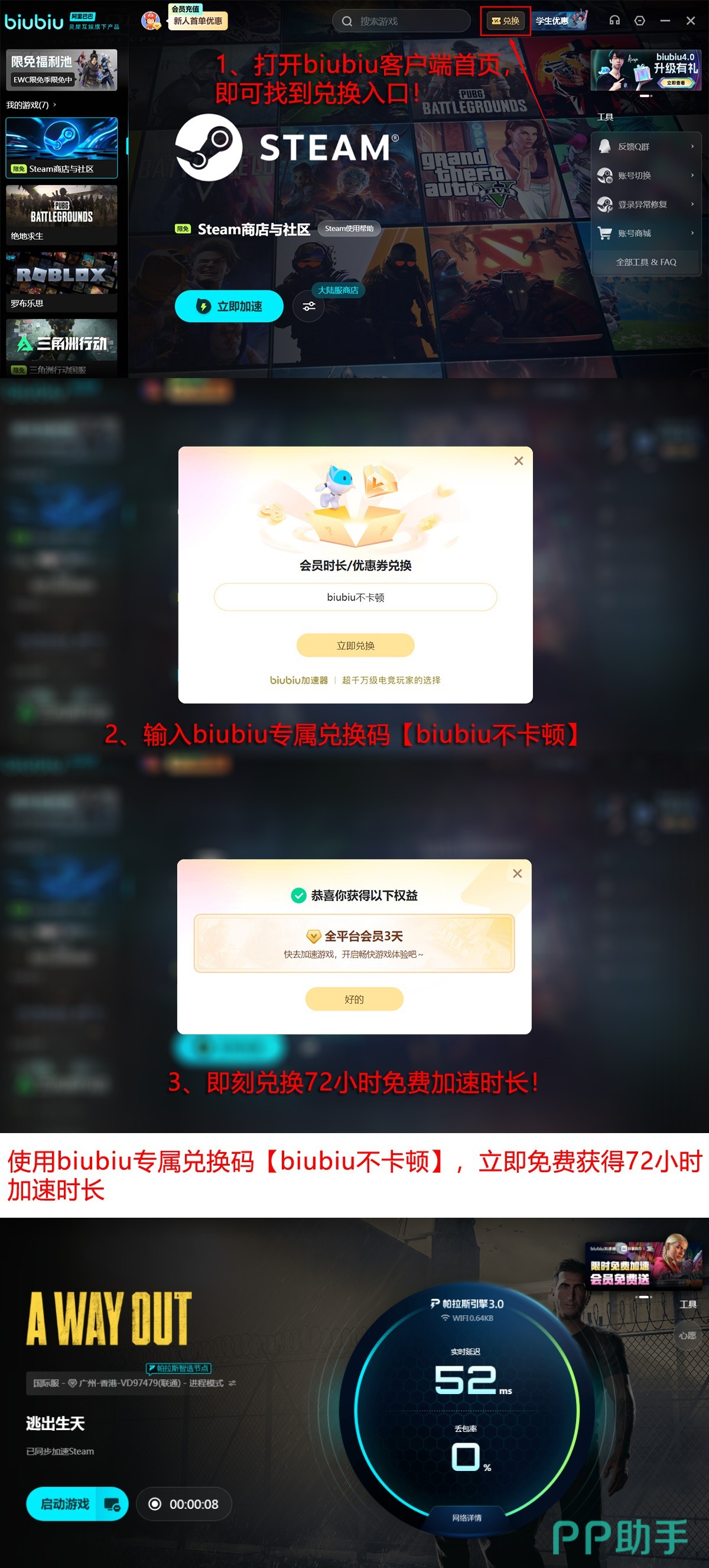 新用户注册后即可自动获取24小时全功能试用权限。输入兑换码【biubiu不卡顿】,还可额外领取3天加速时长,累计达4天体验周期。平台定期推出限时免费加速活动,覆盖多款热门联机作品,综合使用成本具备较强竞争力。