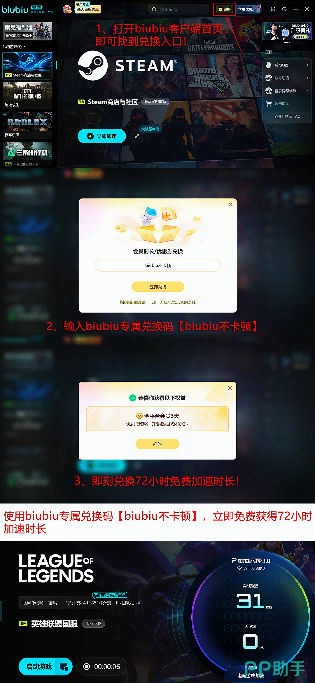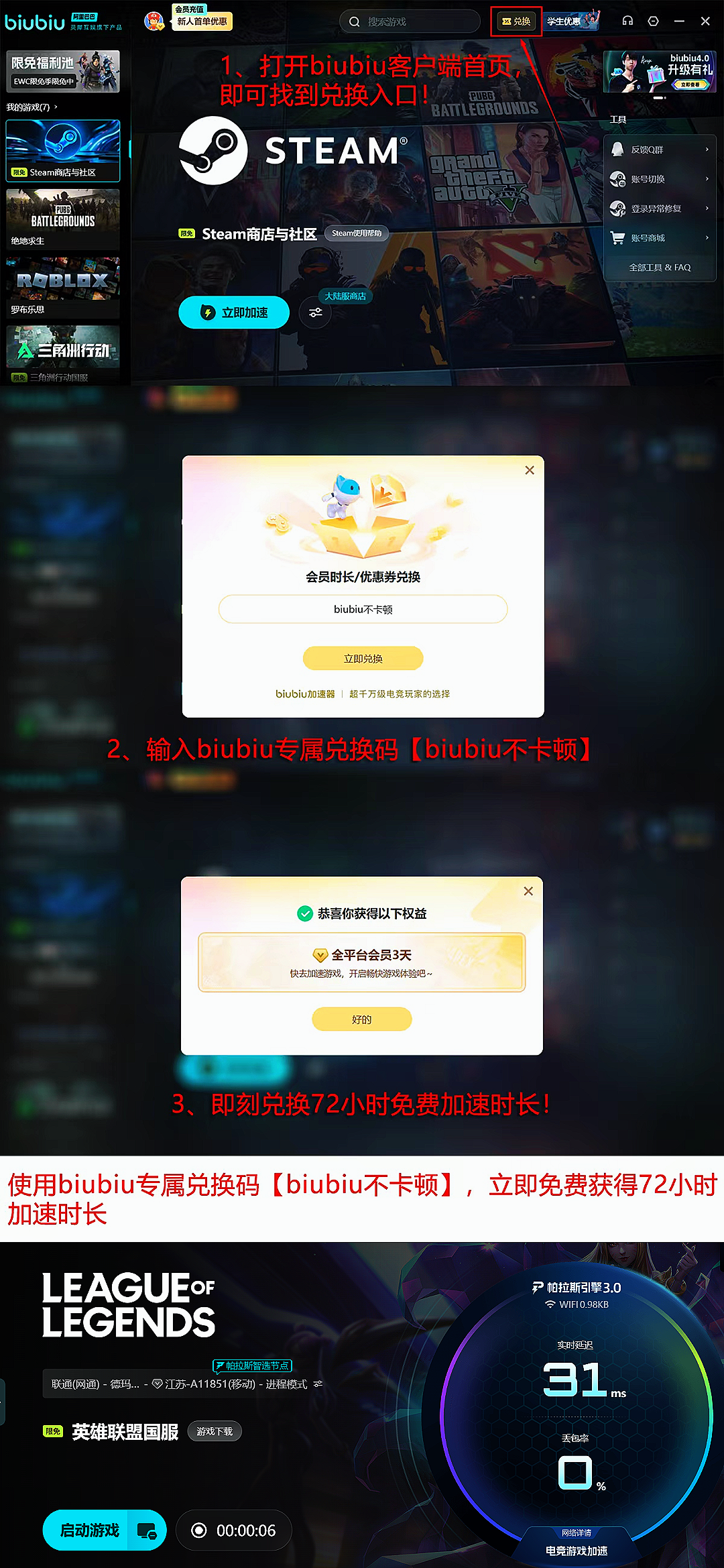 在用户体验层面,biubiu加速器同步强化了新老用户的权益覆盖机制:新注册用户可直接获取24小时全场次、全服区通用的免费加速权限,涵盖任意版本、任意大区;输入专属兑换码【biubiu不卡顿】还可额外激活3天连续加速时长,总计达96小时;该福利同样面向已有账户开放,无需绑定设备或限制使用频次。