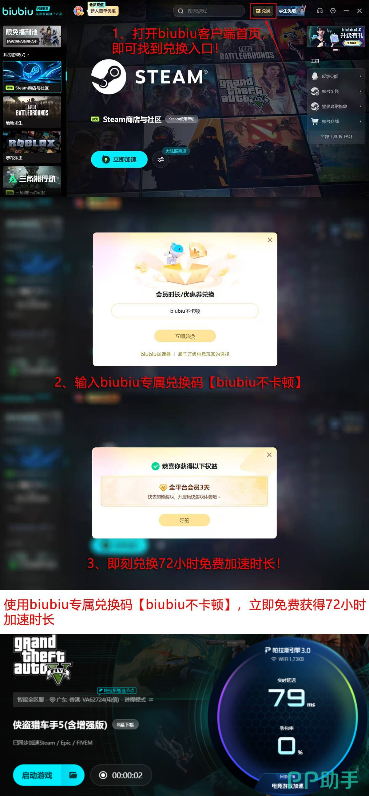 新用户完成注册后即可激活首日无门槛试用权限,时长为24小时;输入专属口令【biubiu不掉线】可额外延长至连续72小时稳定连接;叠加新人权益后,总计可享96小时高质量加速服务。