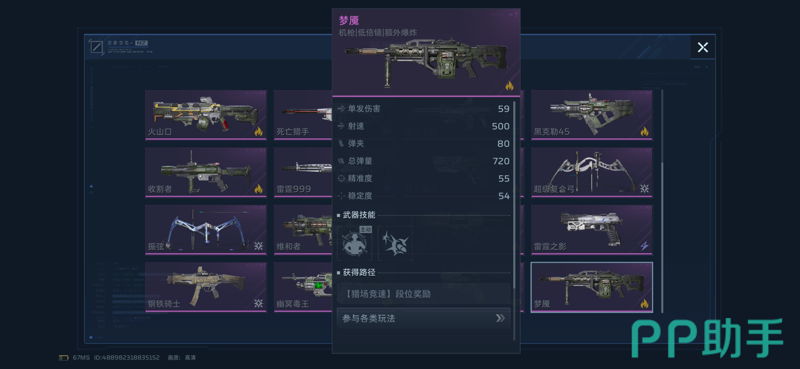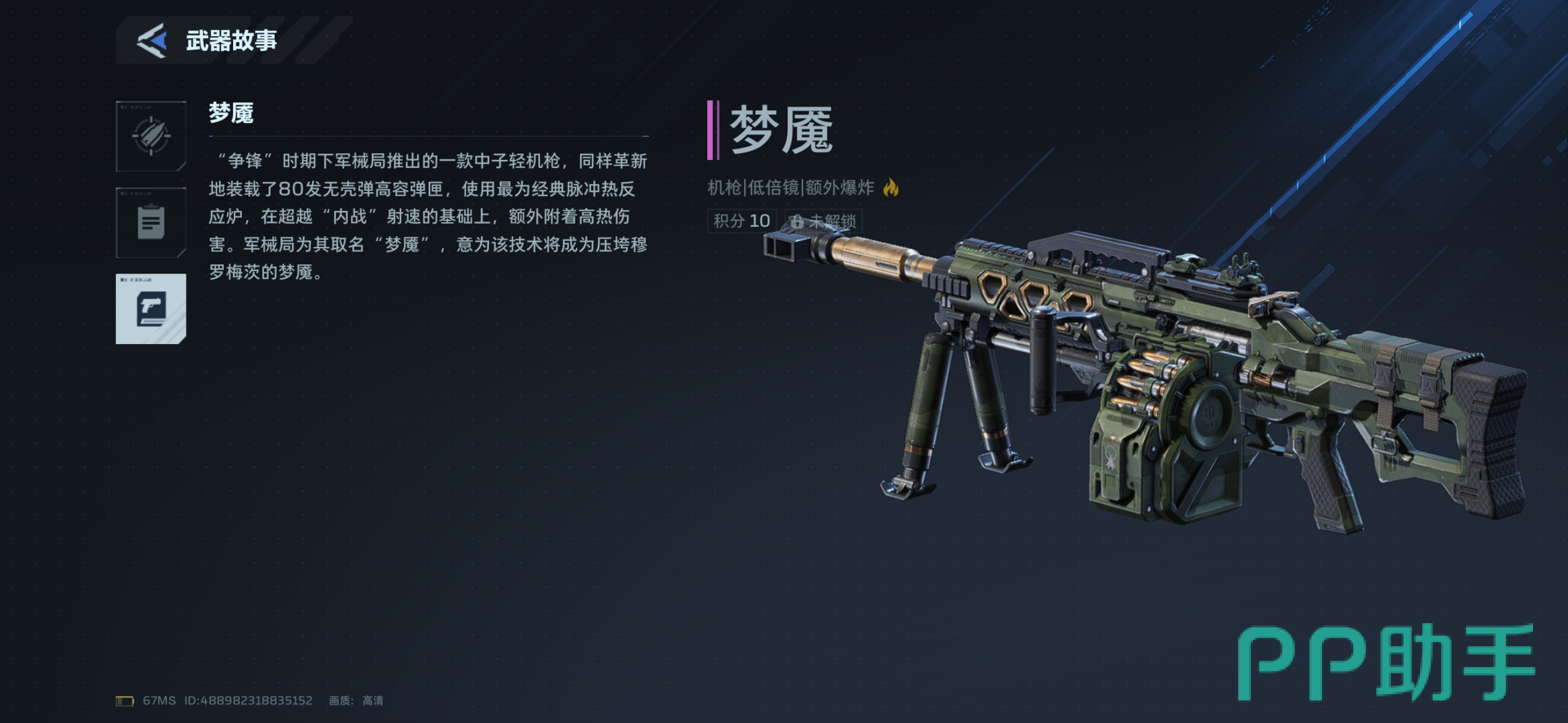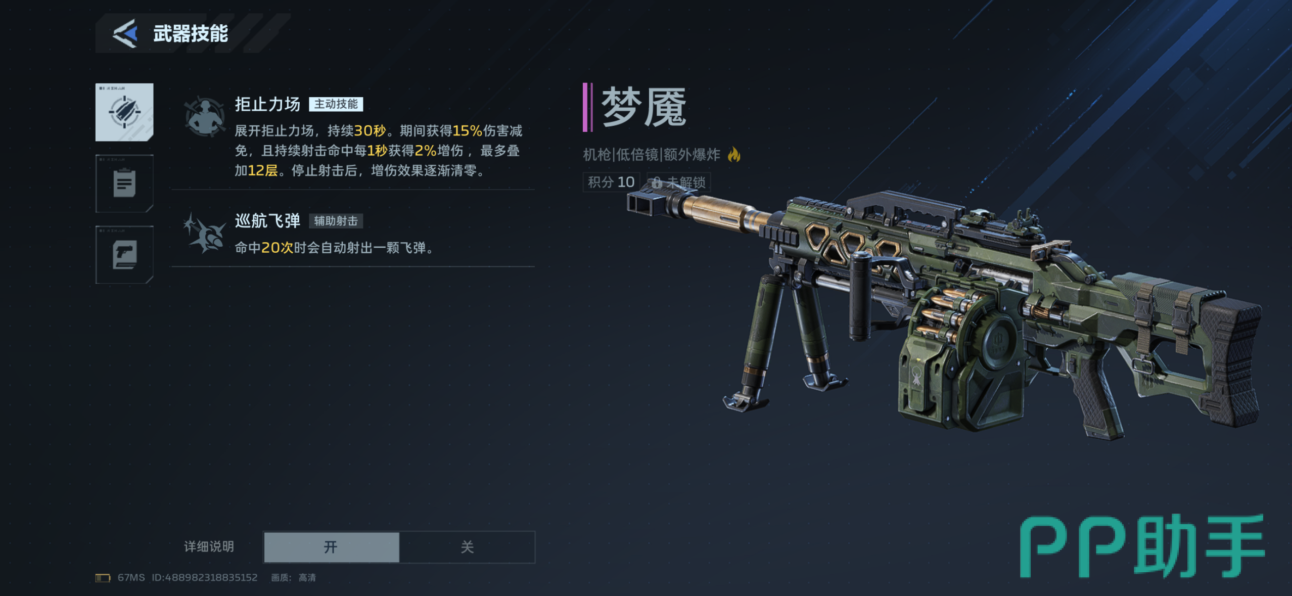 梦魇作为钢铁起源新赛季中新推出的武器,属于史诗级别的武器,会有很大概率只要蓝色的跃迁秘藏就能开出,就算不能开秘藏获得,也能通过猎场竞速模式的段位来结算,段位要求不高。这把武器的射击特点是弹夹容量高,还能连续发射。在主动技能上有非常高数值的增伤效果,还能最多叠12层伤害,被动技能上命中20次时额外触发一棵飞弹,从技能上就可以看得出这是一个非常好用的武器,如果再装配上合适的配件,在塔防战或者是刷难度本的时候都会非常好用。