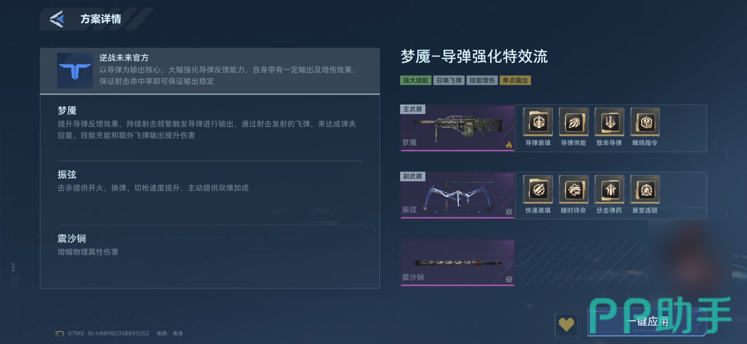 在梦魇的装配上,最适合它的流派就是特效流突出武器的飞弹和增伤效果。在配件选择上,最佳装配是导弹填装、导弹供能、知名导弹、蜂鸣响应,这个出装思路就是加强武器的续航能力和导弹能力。在前期如果玩家想要尝试的话,建议按照系统自动推荐的配件先装配上。