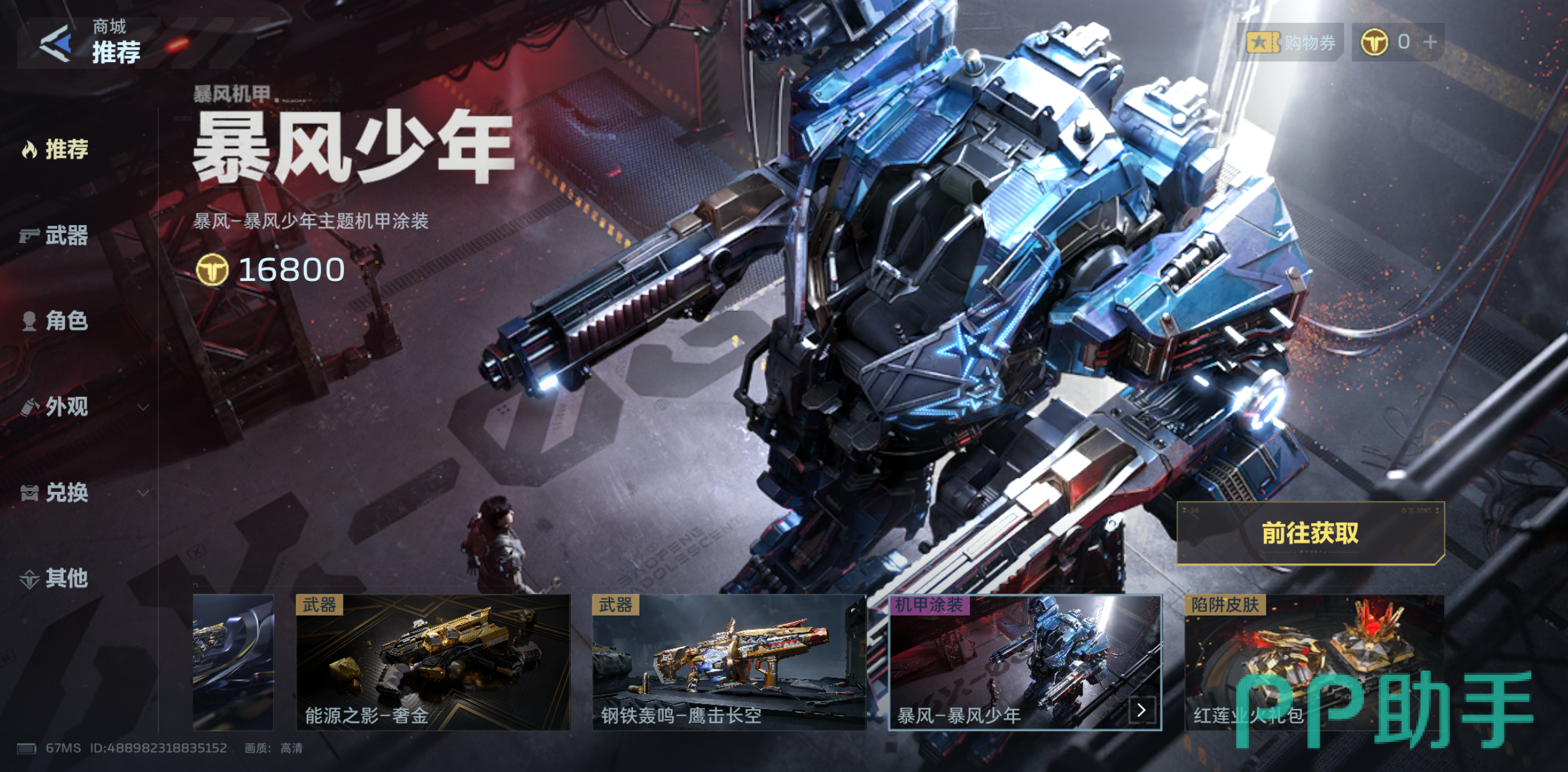 通过游戏的图鉴中可以了解到目前有3个机甲类型,2个机甲涂装类型,在涂装上有暴风机甲-暴风少年和火线磐石-陨铁两个。不过就当下游戏进度而言,只在商城上推出了暴风少年外形涂装的暴风机甲,这个机甲的售价为16800NZ点。