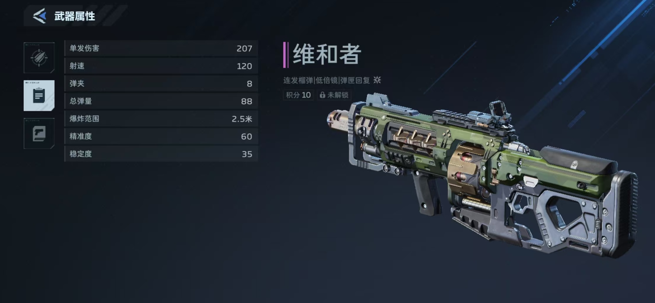 众多武器的使用攻略都在九游专区免费提供,九游作为手游福利最好的平台,这里除了有海量游戏礼包免费领取,节假日和活动日会及时更新礼包之外。还拥有签到抽奖,玩游戏每天领工资等福利。维和者属于连发榴弹,它具有低倍镜效果。在基础属性方面,单发伤害207,射速120,弹夹容量8发,总弹量88发,造成的爆炸范围是2.5m。