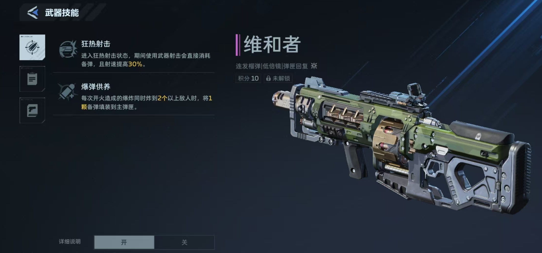 自身的技能是狂热射击,进入此状态后使用武器射击会直接消耗备弹,射速提高30%,相当于开启了爆发输出模式。每次开火造成的爆炸,同时炸到两个以上敌人时,可以将一颗备弹装填到主弹匣中。这款武器的主要作用是用来pve中刷群怪和刷分,在pvp中的表现一般。可以利用爆炸aoe和命中效果,在刷群怪的时候持续不断的输出伤害,前期刷钱和攻击效率都很高。