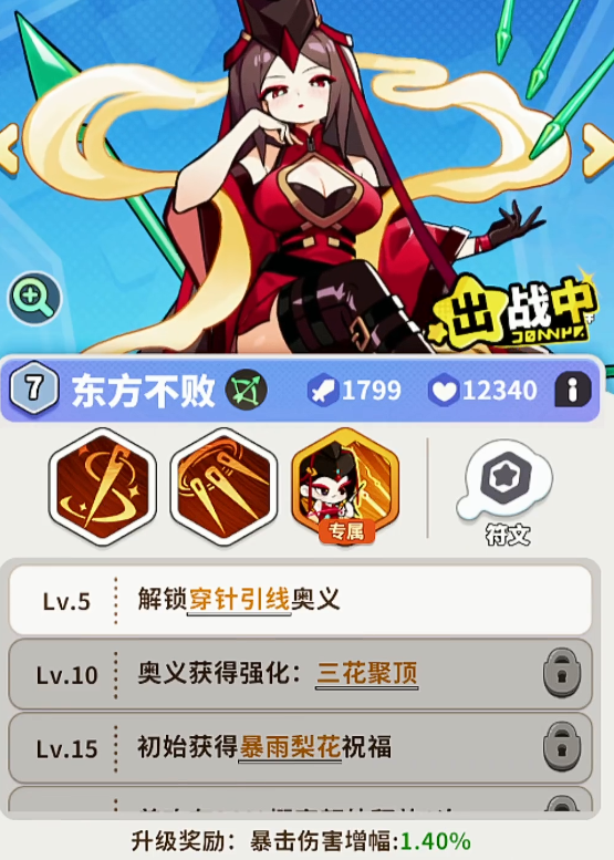 然后就是东方不败,东方不败的输出模式是使用飞针进行攻击,这个飞针的攻击频率很快,基本上每秒钟都能释放大量的金针进行攻击,虽然这个针的攻击频率很快,但毕竟还是单体伤害,只能针对小波次的怪物以及boss,比较适用于日常的清图,伤害倍率方面还算可以。