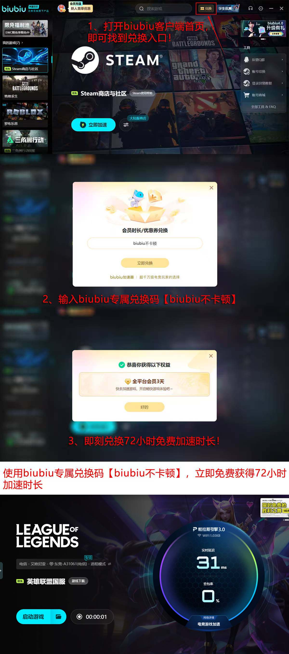 目前,biubiu加速器面向新用户提供限时体验权益:注册即赠24小时免费使用时长,自动生效;另可通过首页“兑换”入口输入口令【biubiu不卡顿】,额外领取72小时服务权限。两项叠加,总计可享96小时无门槛试用期,便于玩家充分评估其在LOL新版本中的实际优化效果。