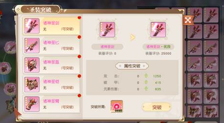 突破功能是圣装进阶的核心环节。使用突破石可激活单件圣装的突破状态,突破后各项基础属性(如攻击、防御、元素抗性、真实伤害加成等)将获得显著增幅。突破石可通过日常任务、周常副本及周期性运营活动持续获取,强调长期积累与策略规划,而非依赖一次性充值。