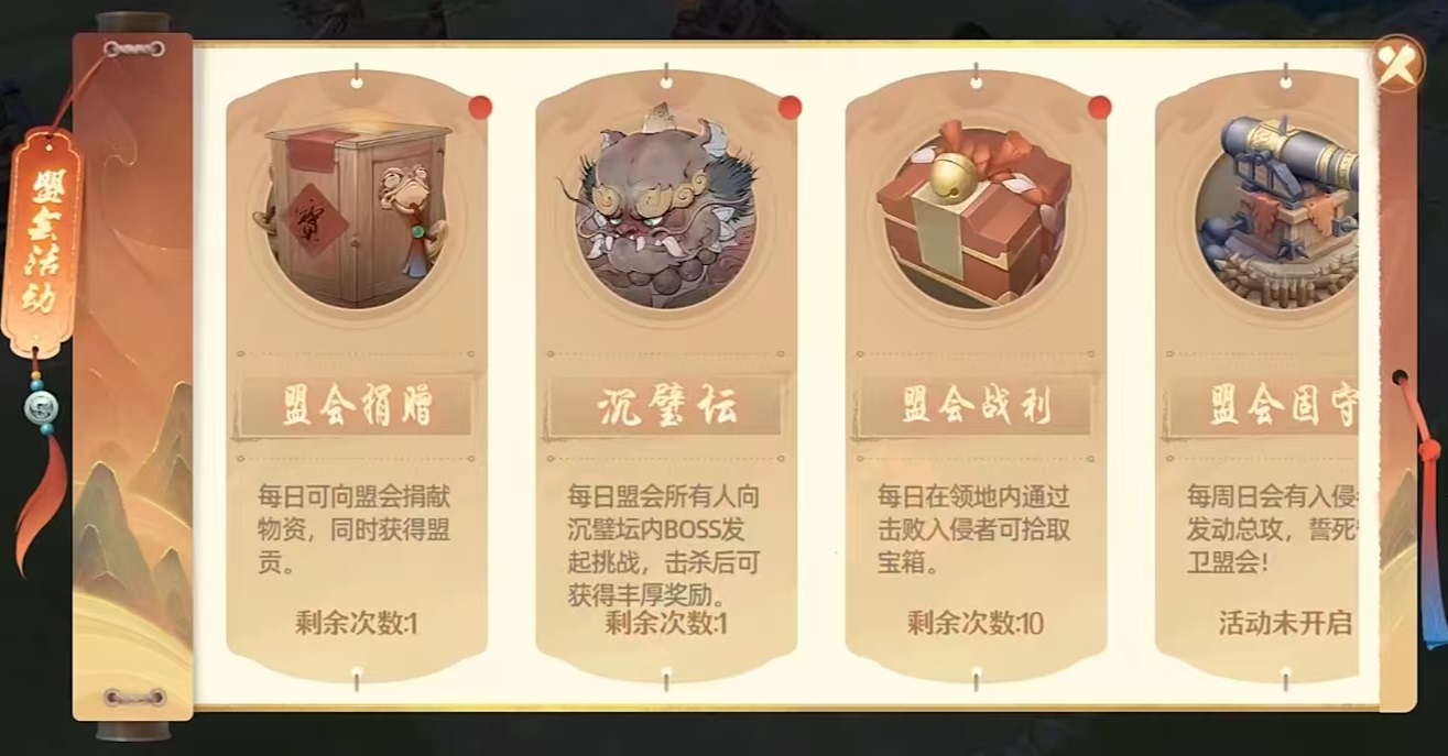 盟会战利指的是每天在领地中可以发现入侵者,将这些入侵者击败,可拾取宝箱,每天能够完成10次。沉壁坛是打BOSS活动,每天都可以挑战,击杀后获得奖励。盟会固守活动是每周日会有入侵者发动总攻,保卫盟会可获得丰厚奖励。这些活动都是盟会玩法的重要组成部分,每天都要记得参加。