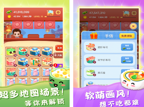 创新融合三消与角色养成要素。所有寿司均拟人化为带表情的萌系角色,分布于多张主题地图中。核心玩法为相邻同类型寿司两两合成,生成更高等级品种并获得经验。随着等级提升,解锁新地图、新寿司形态及装饰组件,构建个性化寿司宇宙。