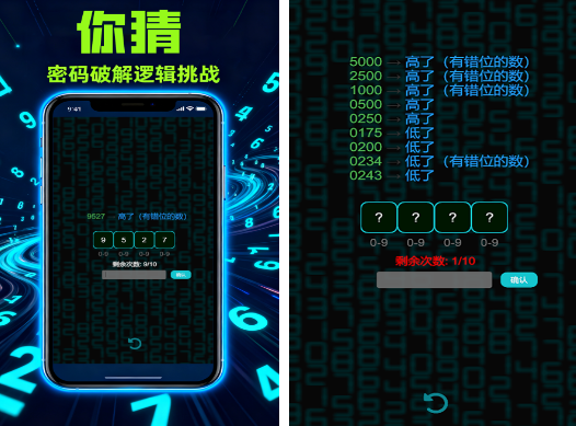 基于数字逻辑推理的经典玩法,系统生成n位随机数(允许重复),玩家拥有10次猜测机会。每次输入后,界面反馈“高”或“低”的提示信息,需综合历史数据与概率判断锁定答案。规则简洁但策略性强,适合喜欢烧脑挑战的用户。