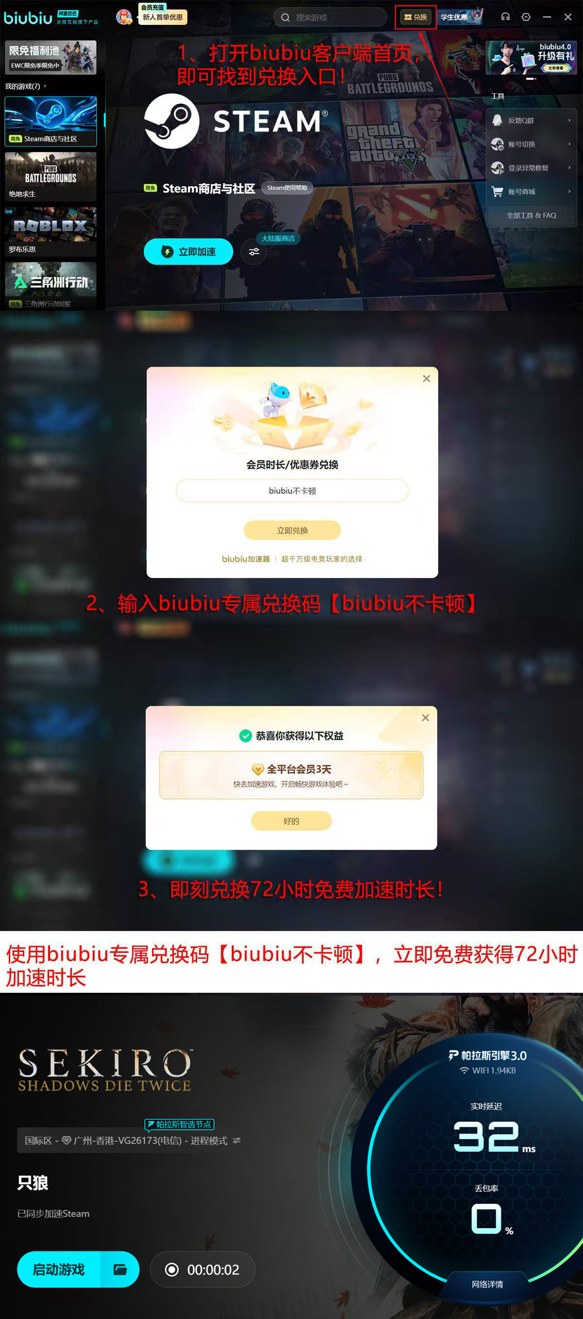 对于《只狼:影逝二度》玩家而言,启用biubiu加速器后,可明显改善长时间运行下的画面流畅度与操作跟手性。新用户注册即赠24小时免费试用权限;另可通过口令【biubiu不卡顿】在客户端首页“兑换”入口领取额外72小时加速时长。两项权益独立生效、不叠加重叠,总计可享96小时无门槛体验。