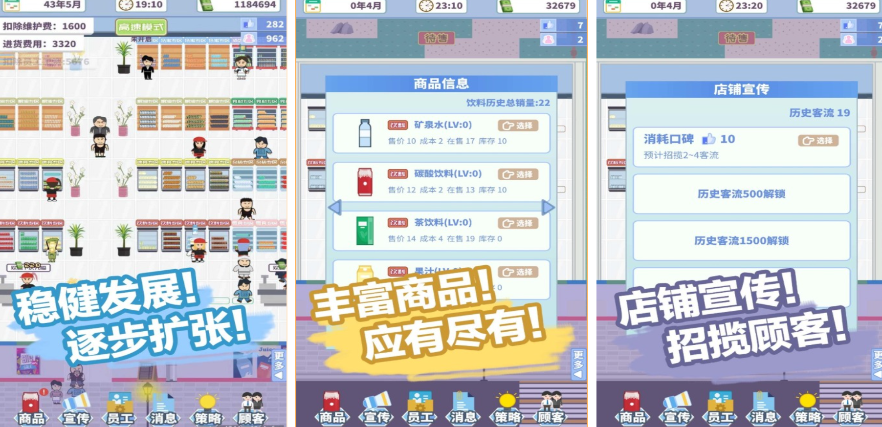 本作以强策略性为核心,将资金流管控、人力配置与仓储优化置于同一决策框架下。玩家需实时计算边际成本、预测商品生命周期,并在坪效受限的前提下动态调整货架结构与采购节奏。每一次调价都触发精准的销量反馈模型,使定价行为真正成为影响周转率的关键变量。