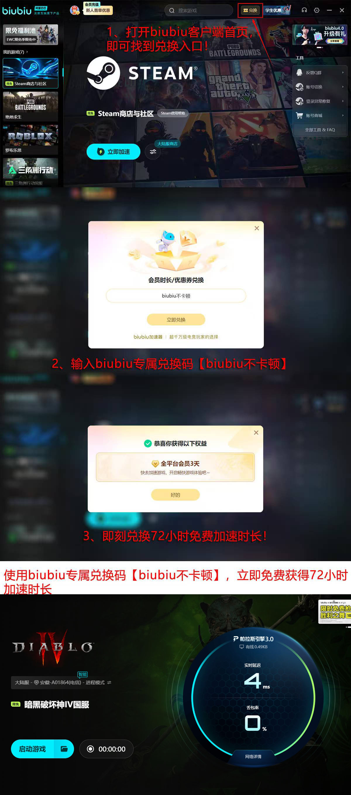即刻体验无需等待:新用户注册后将自动获得24小时全功能免费试用权限;完成注册后,进入客户端首页点击“兑换”,输入口令【biubiu不卡顿】,即可额外领取72小时加速时长。两项权益叠加总计96小时,足够完整体验圣休亚瑞大陆的全部赛季内容与高难度挑战。