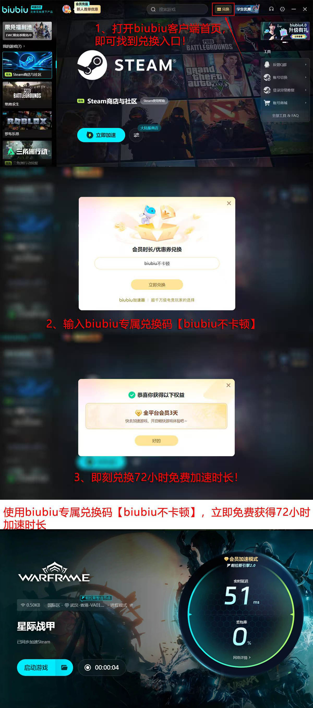 在竞技向体验层面,稳定低延迟带来的提升是质变级的:技能衔接更精准、战术走位更可控、团队配合响应更及时。目前新用户完成安装并注册账号,即可自动获赠24小时加速时长;另可通过客户端首页“兑换”弹窗,手动输入口令【biubiu不卡顿】领取额外72小时,两项权益可叠加使用,总计达96小时免费体验期。
