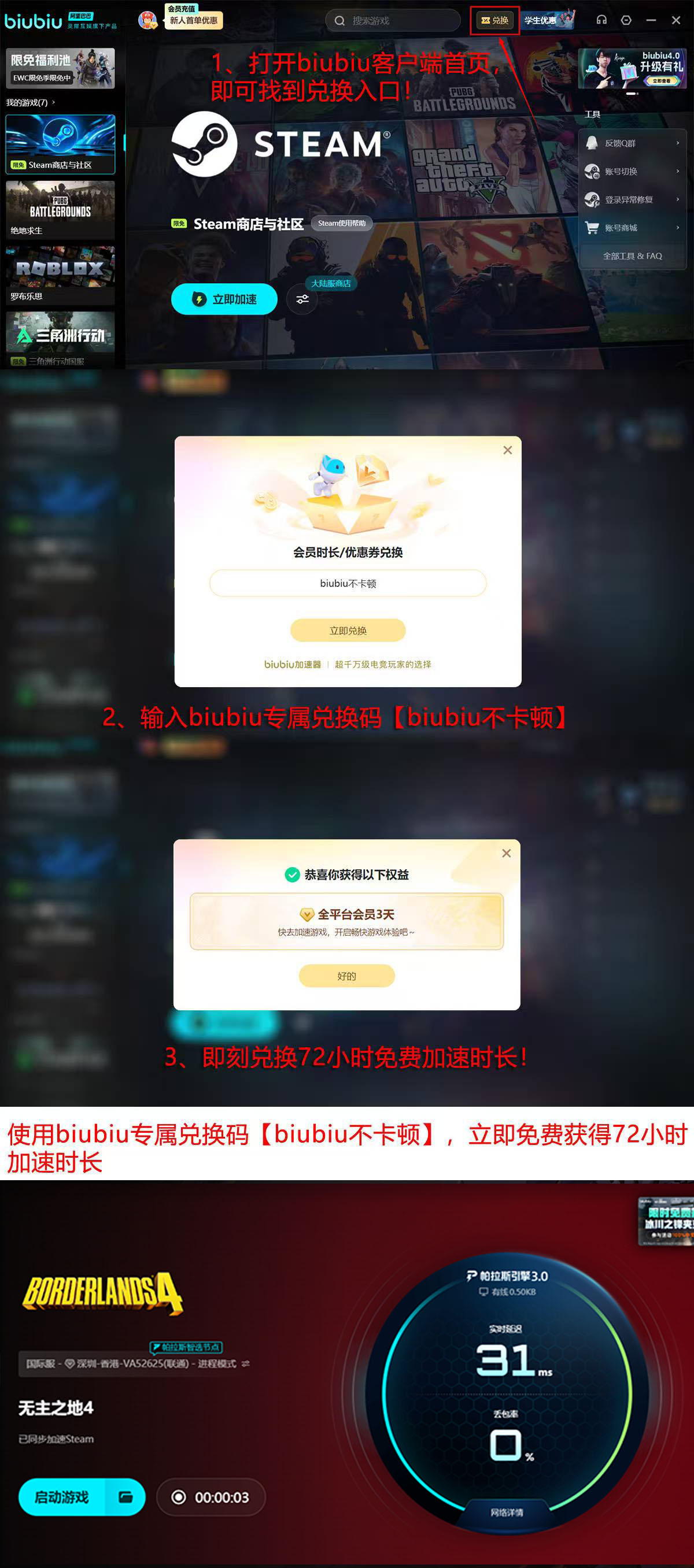 对于《无主之地4》这类依赖实时同步与低延迟响应的联网射击游戏而言,网络质量直接决定操作反馈精度与战斗容错空间。目前用户可通过两种方式免费获取总计96小时加速权限:完成基础注册后,账户将自动激活24小时高级特权;登录客户端后,进入首页“兑换”页面,输入口令【biubiu不卡顿】,即可额外领取72小时使用权。两项时长叠加生效,无需手动叠加操作。