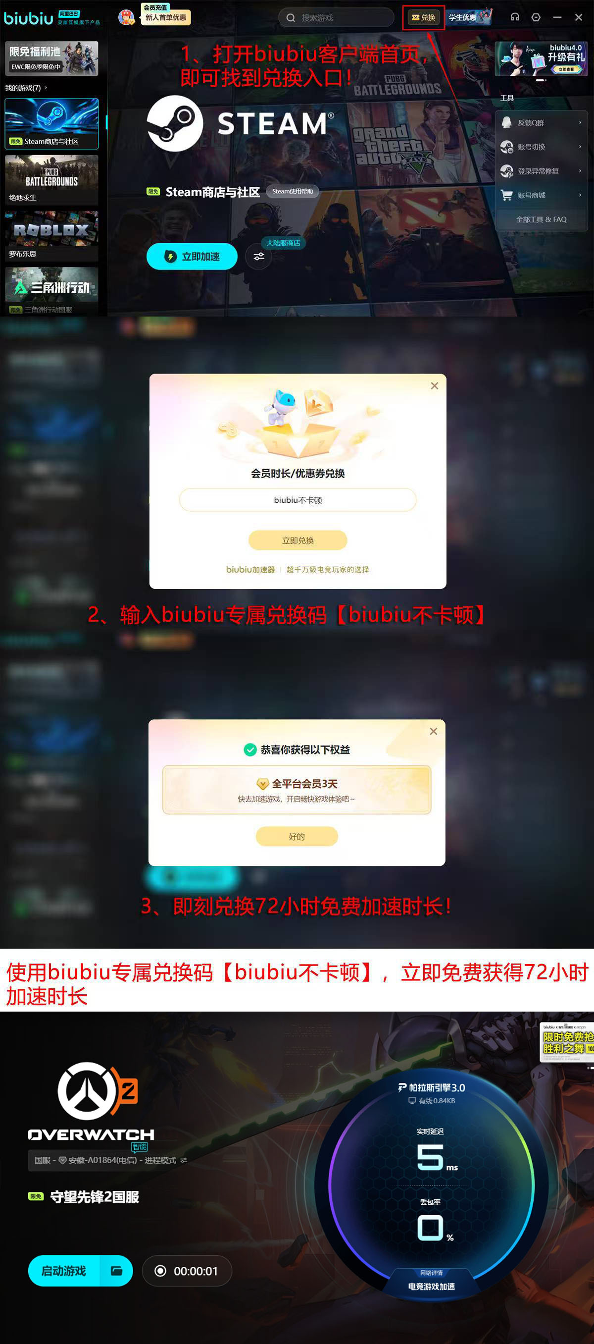 目前新用户可享双重免费加速权益:完成注册后系统自动发放24小时加速时长;另可通过复制口令【biubiu不卡顿】,在客户端首页点击“兑换”按钮并粘贴提交,额外获取72小时使用权限。两项福利支持叠加,总计可达96小时免付费体验周期。