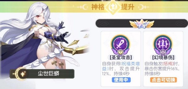 然后是神格对技能的提升,以凯旋皇女为例,守卫职业,神格2二选一,获得祝福类增益时暴抗提升,或者是触发惩戒的时候格挡提升。神格6则是盾牌被击破的时候额外给自己施加最大血量40%的护盾。