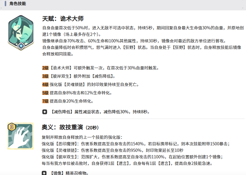 主要的天赋能够创造镜像,并且还是在低血量的时候触发,还能有一段时间的无敌效果,针对玩家的时候会产生许多的影响,这是各位都需要面对的效果影响,针对这个角色无疑是非常有用的,再配合奥义的效果能够多次释放技能打出多段的伤害效果。