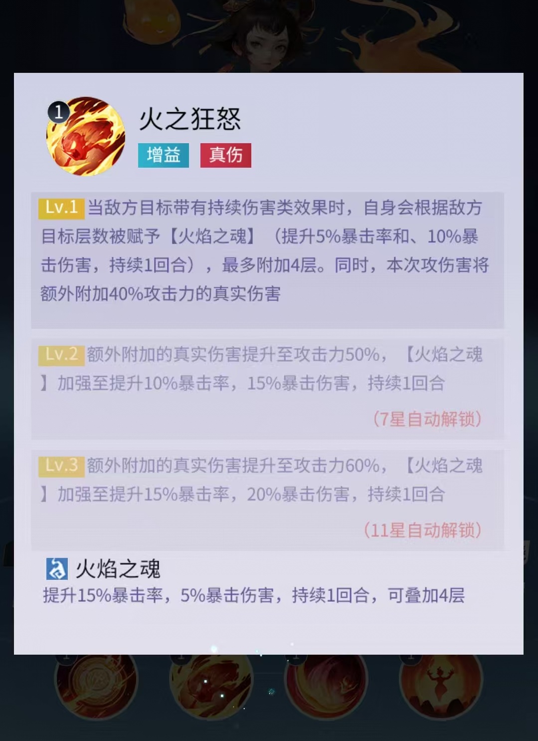第二个技能效果是如果敌方目标身上带有持续伤害类的效果,就可以根据目标身上的层数附加火焰之魂,每层火焰之魂提升5%的暴击率和15%的暴击伤害,最多附加4层,本次攻击还可以附加额外的真实伤害。这里除了红孩儿自身附加的灼烧之外,其他队友附加的灼烧或者是不同名的持续伤害类型,都可以触发这样的效果。这样就可以做到常驻增加暴击率和暴击伤害,所以输出才能非常恐怖。