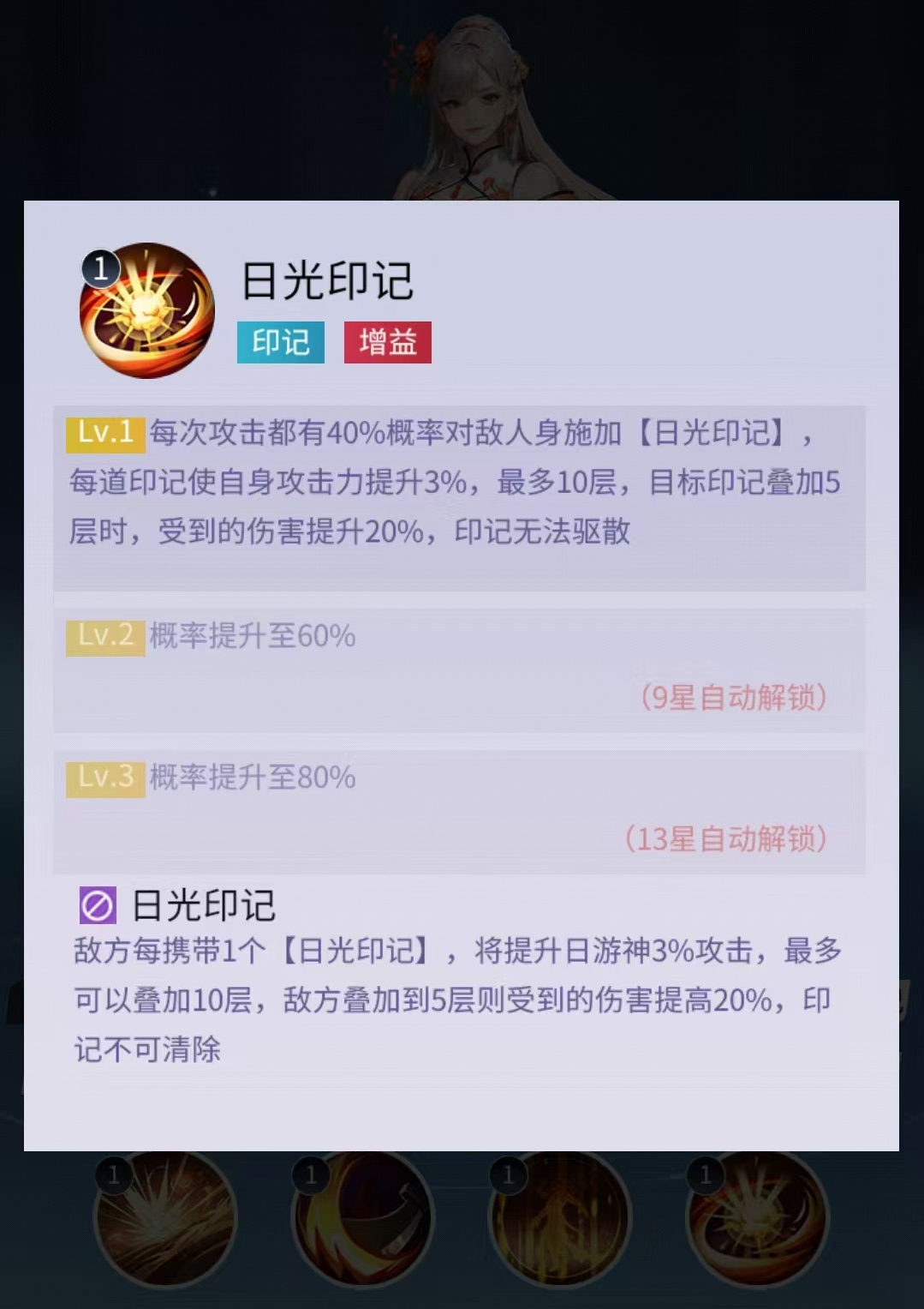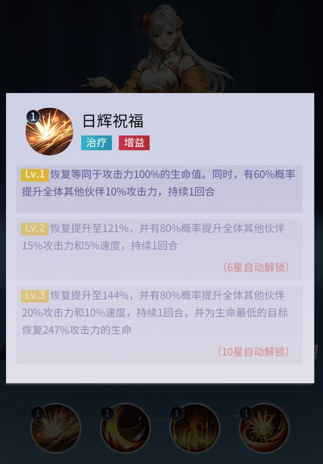 第二个技能属于自身的普攻,可随机伤害三个目标,比较中庸的技能。被动也是提升攻击力、生命值和治疗效果。大招在每次攻击时,都有几率给敌人身上施加日光印记,每到印记可以增加自身3%攻击力,最多叠加10层。目标身上的印记叠加5层时,受到的伤害提升20%。这个技能效果提升自身攻击力也就增加了治疗的能力,提高对方受到的伤害,也就辅助我方更好的输出,所以这个治疗在战斗方面还是比较全面的。
