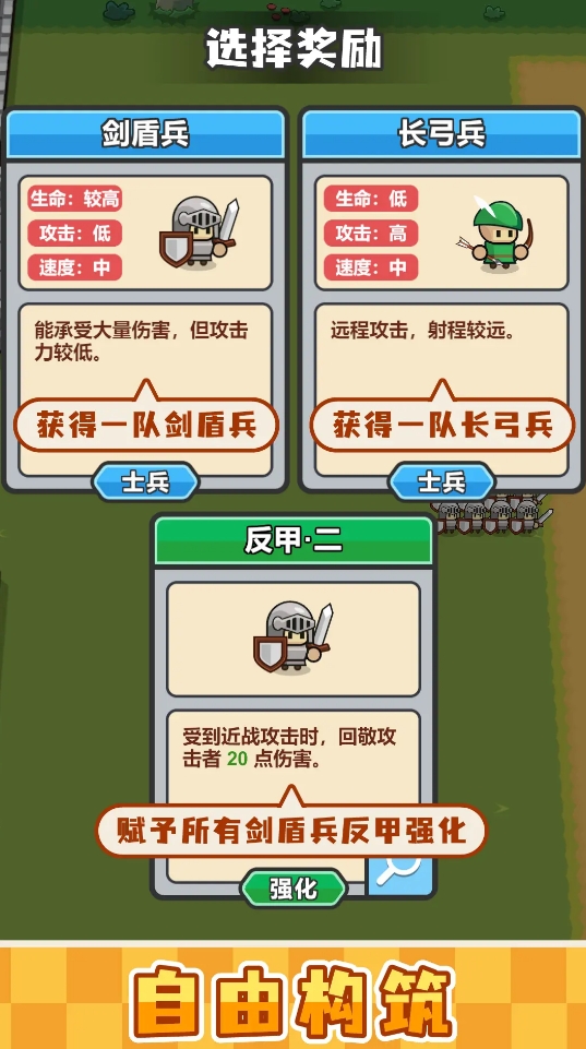 极简规则下的深度策略体验。每轮战斗开始前,系统从三类兵种中随机提供选项,玩家择一招募并投入战场;所选兵种可持续参与后续轮次,直至关卡结束。通过兵种组合、站位调整与技能释放时机把控,实现以少胜多的经典战术乐趣。