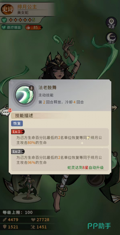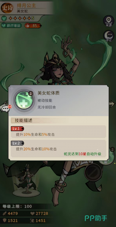被动技能“美女蛇体质”随星级成长提供基础属性加成:初始为10%最大生命值与5%攻击力;升至10星后强化为20%最大生命值与10%攻击力。其中生命值加成显著提升其站桩稳定性,降低被秒杀风险。实战中技能释放顺序至关重要——必须优先启用“艳后蜜语”,以此激活增益状态,从而放大后续治疗与输出的综合收益。若跳过此步骤直接使用治疗技能,将导致整体战力利用率大幅下滑。