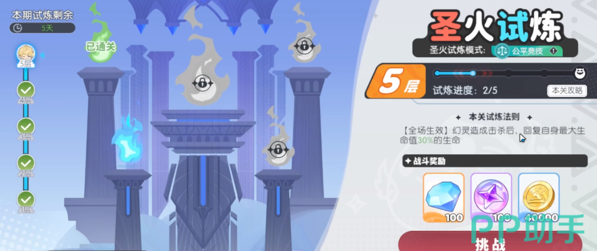 需特别注意:圣火试炼采用统一战力规则——所有参战幻灵的基础等级、星级、装备属性均被系统标准化锁定;仅巨龙类幻灵可额外生效其固有星级加成、龙巢被动及龙语魔法技能。这意味着角色实际养成进度不影响试炼表现,胜负关键完全取决于阵容职能分配、元素协同逻辑与技能释放节奏。此外,该活动每赛季持续8天,逐层解锁,每层通关即发放钻石与金币,第五层通关奖励为神话召唤券,具备极高资源价值。