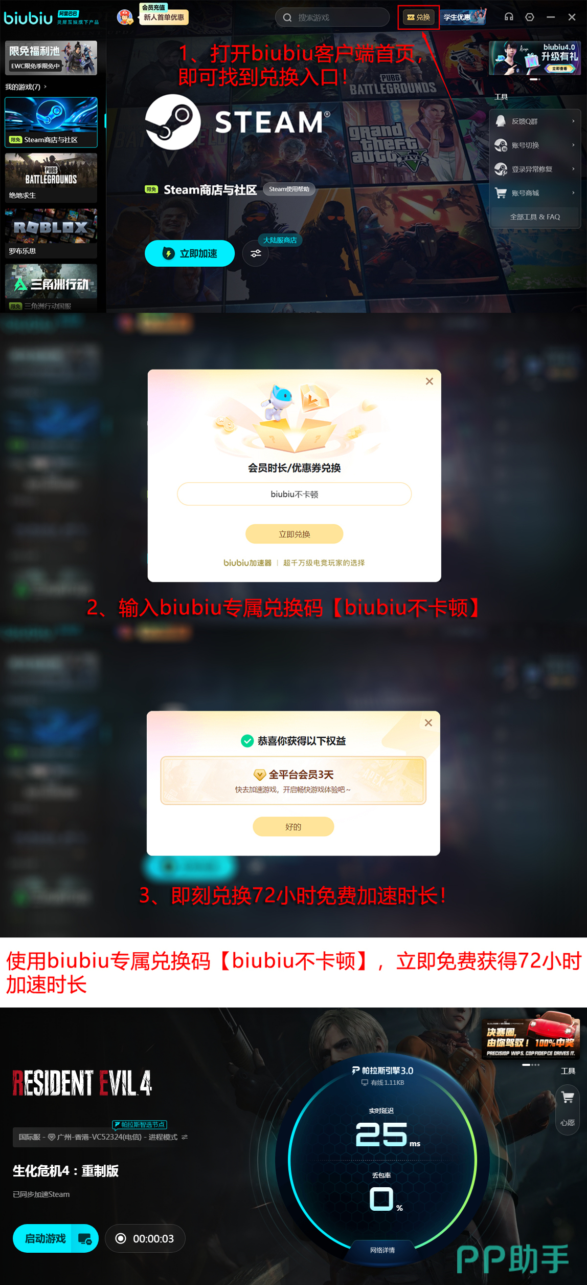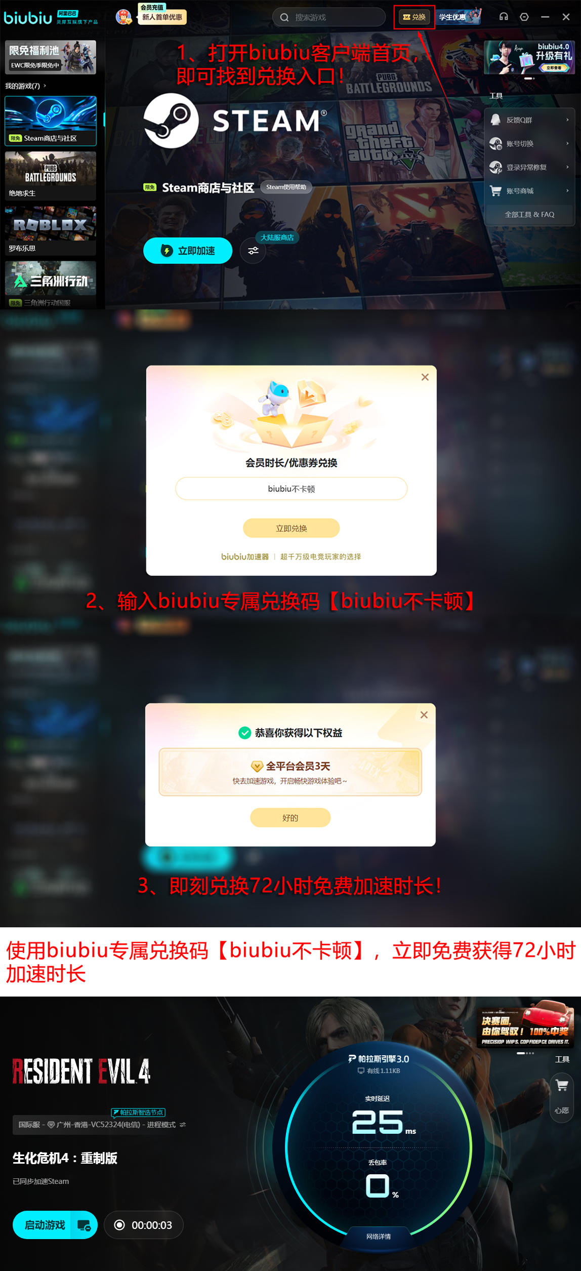 为降低新用户尝试门槛,biubiu加速器现开放首日免费体验权限:完成账号注册即可领取24小时全节点加速服务。此外,面向全体用户推出限时回馈活动——在客户端内兑换框输入激活码【biubiu不卡顿】,可立即获得连续72小时高速通道使用权。